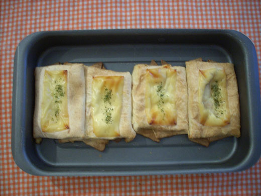 Se corta los cuatro tranchetes que sobran por la mitad y se colocan encima de cada tortilla, se espolvorea el perejil picado sobre los quesos, para darle un toque de color verde.