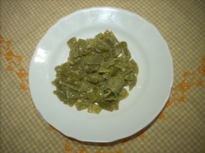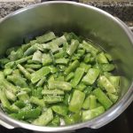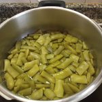 Se le quita a las judías verdes la punta y los filos de los lados, se trocean en trozos de ½ dedo de largo más o menos si son fresca.