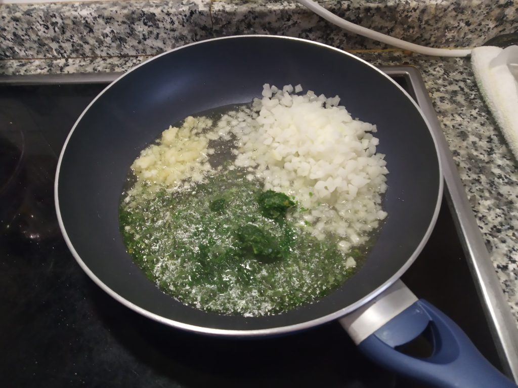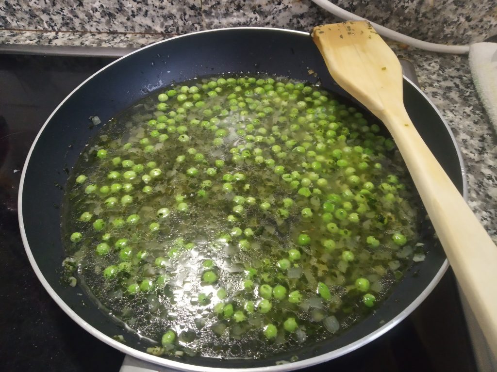 Freír la cebolla, ajo, perejil, pimienta y añadir los guisantes, un poco de sal y el agua.