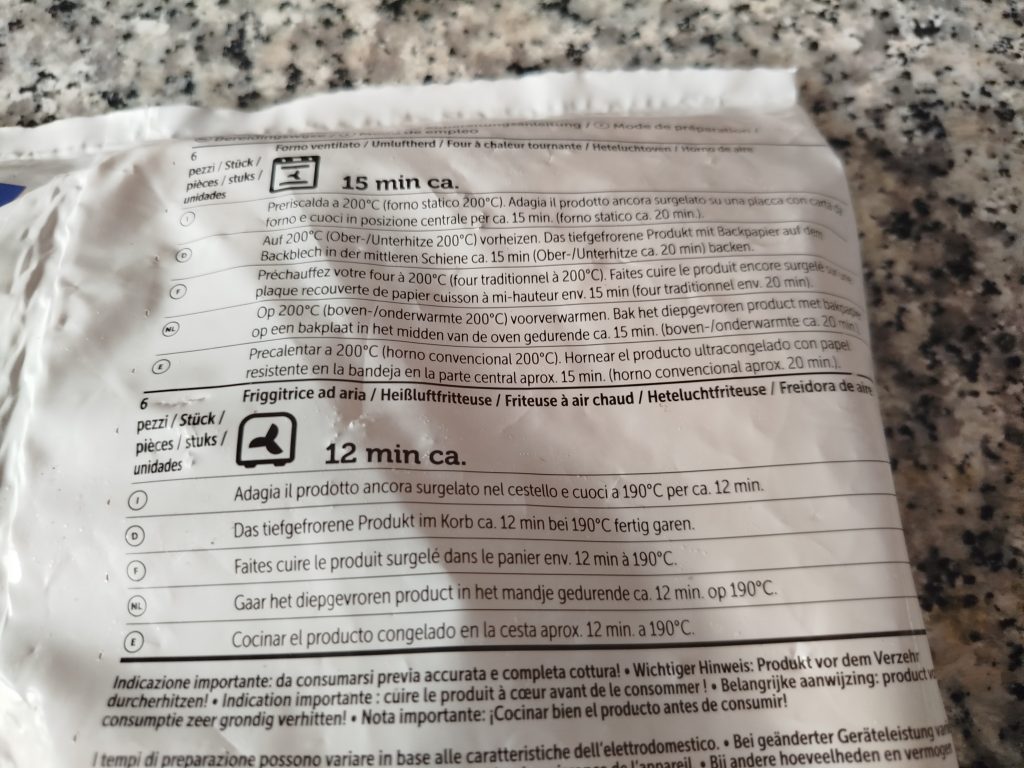 En el Horno, indica en el paquete hacerlo a 200ºC durante 15 o 20 minutos, según elijas o sea, de aire o convencional, suelo calentarla también a 200ºC durante 15 minutos.