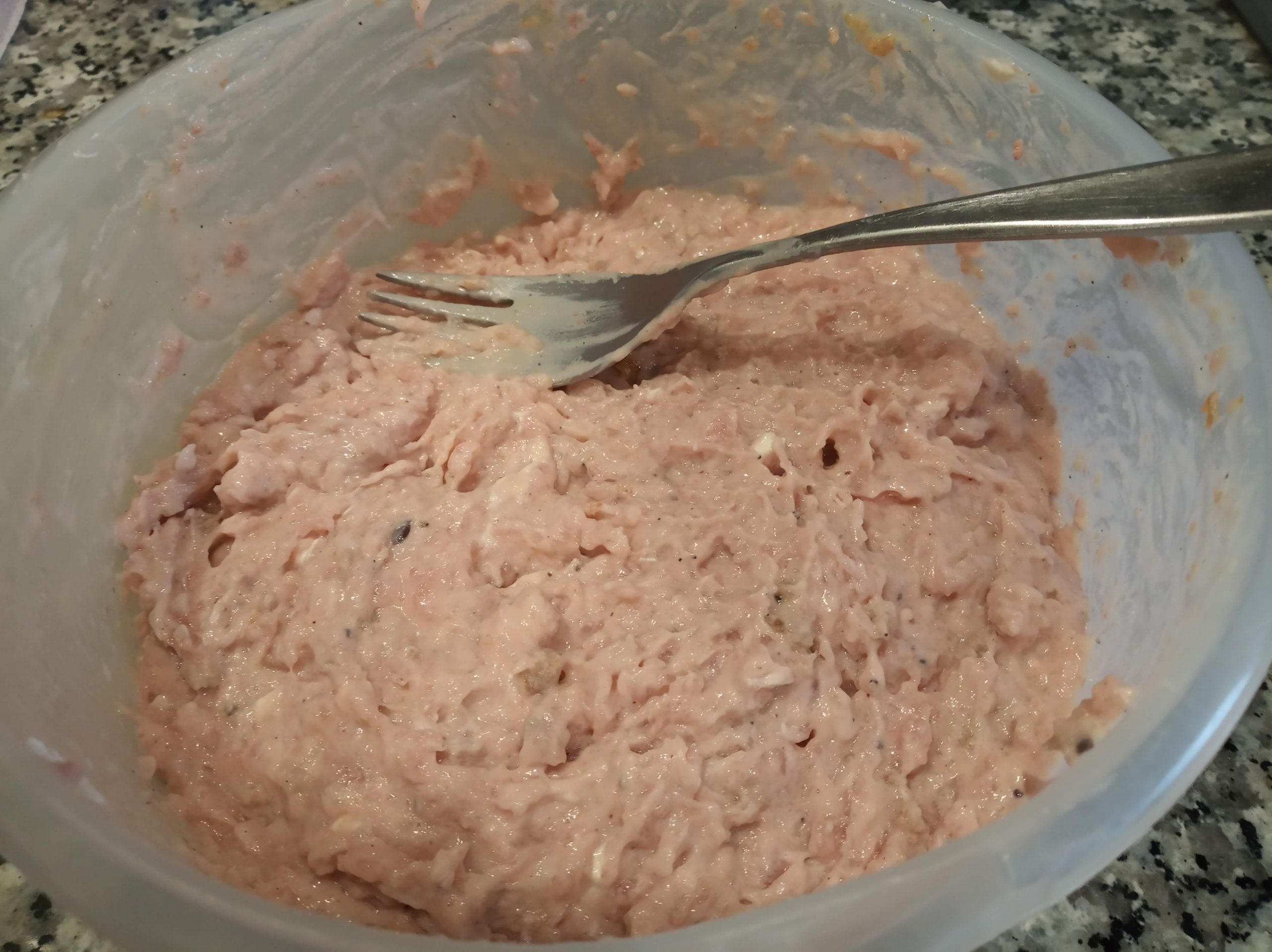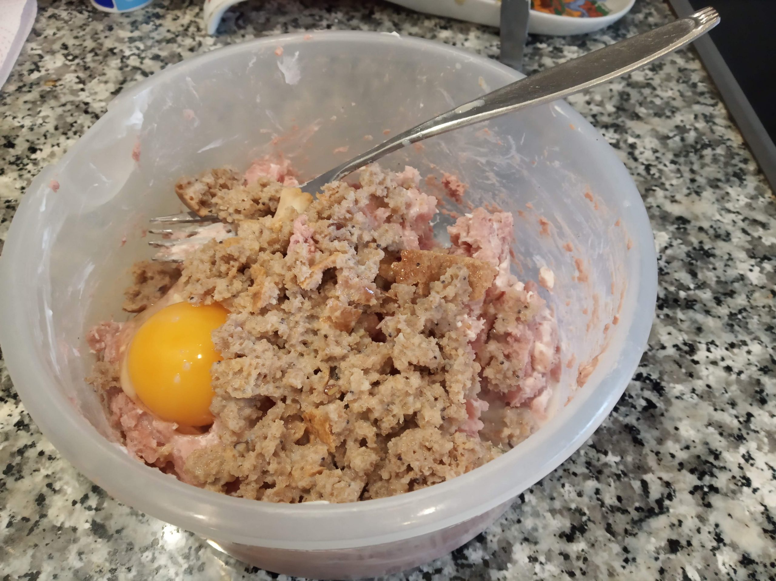 Incorporamos el pan hidratado desmenuzado y el huevo. Mezclar todo muy bien, dejar reposar unos 20 minutos en la nevera.
