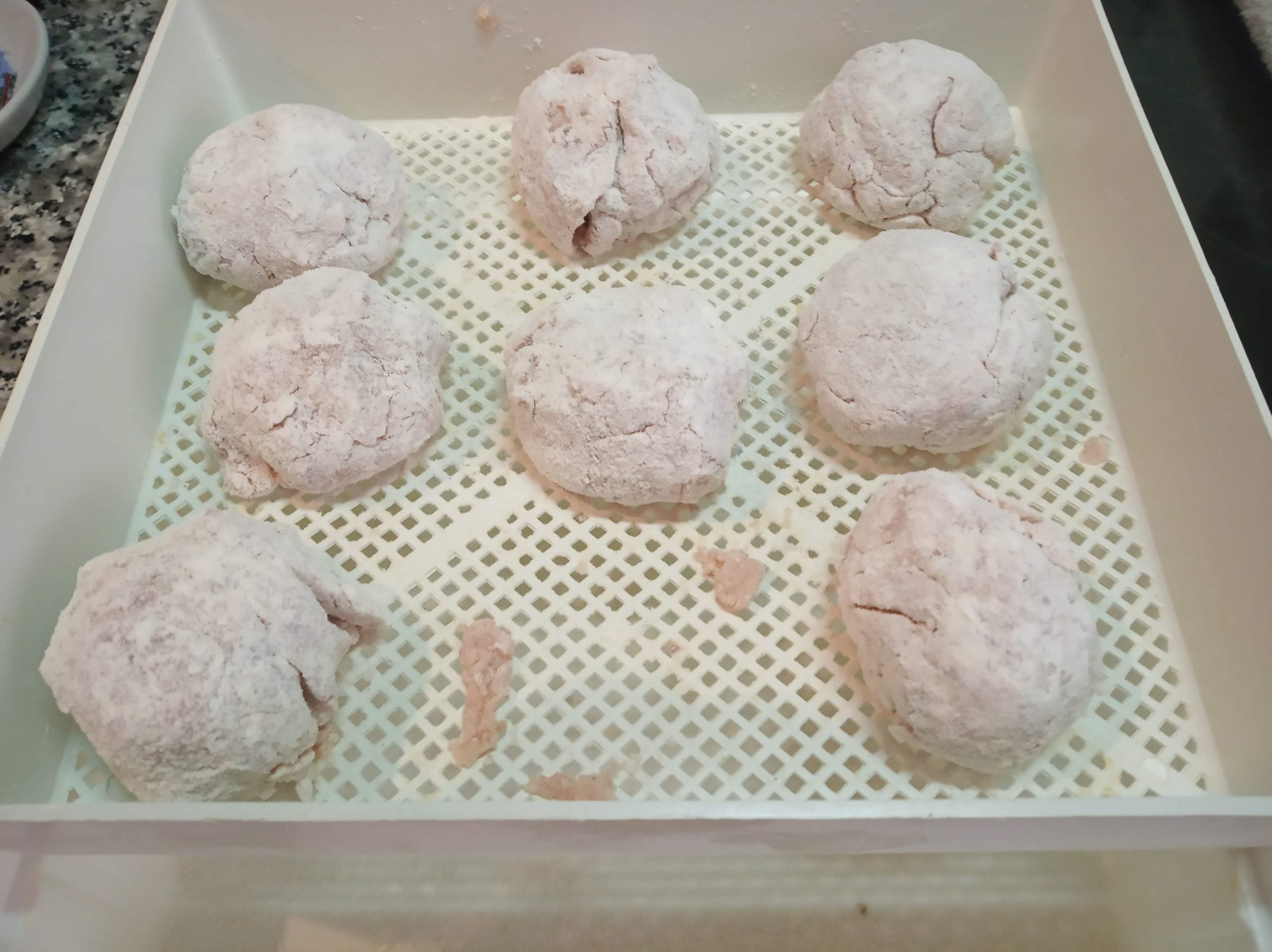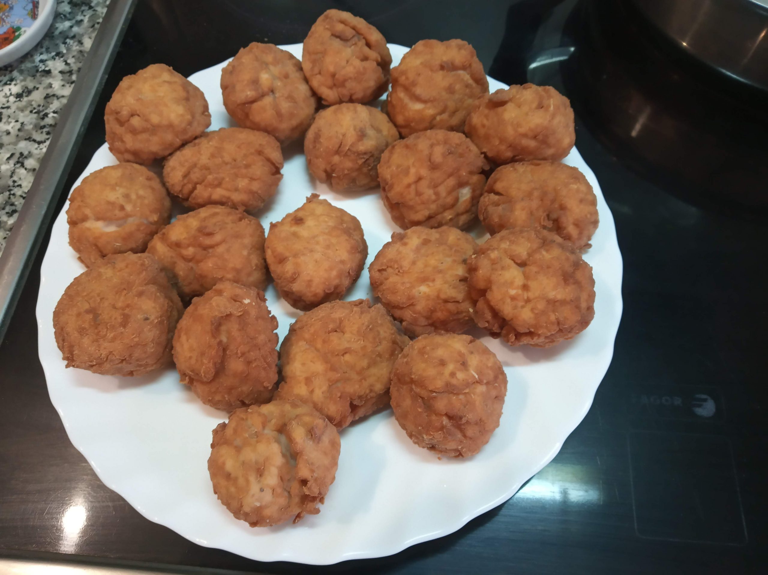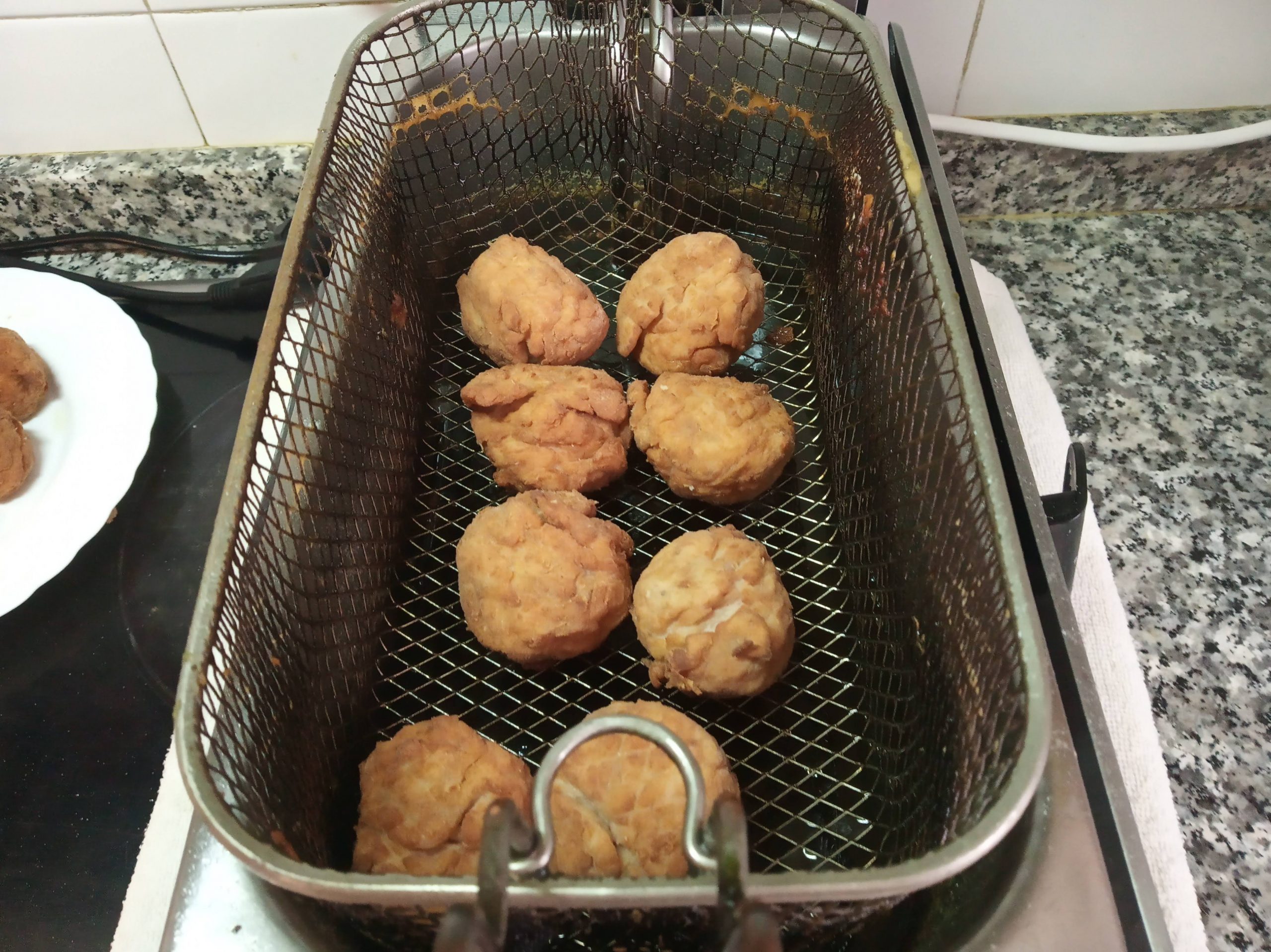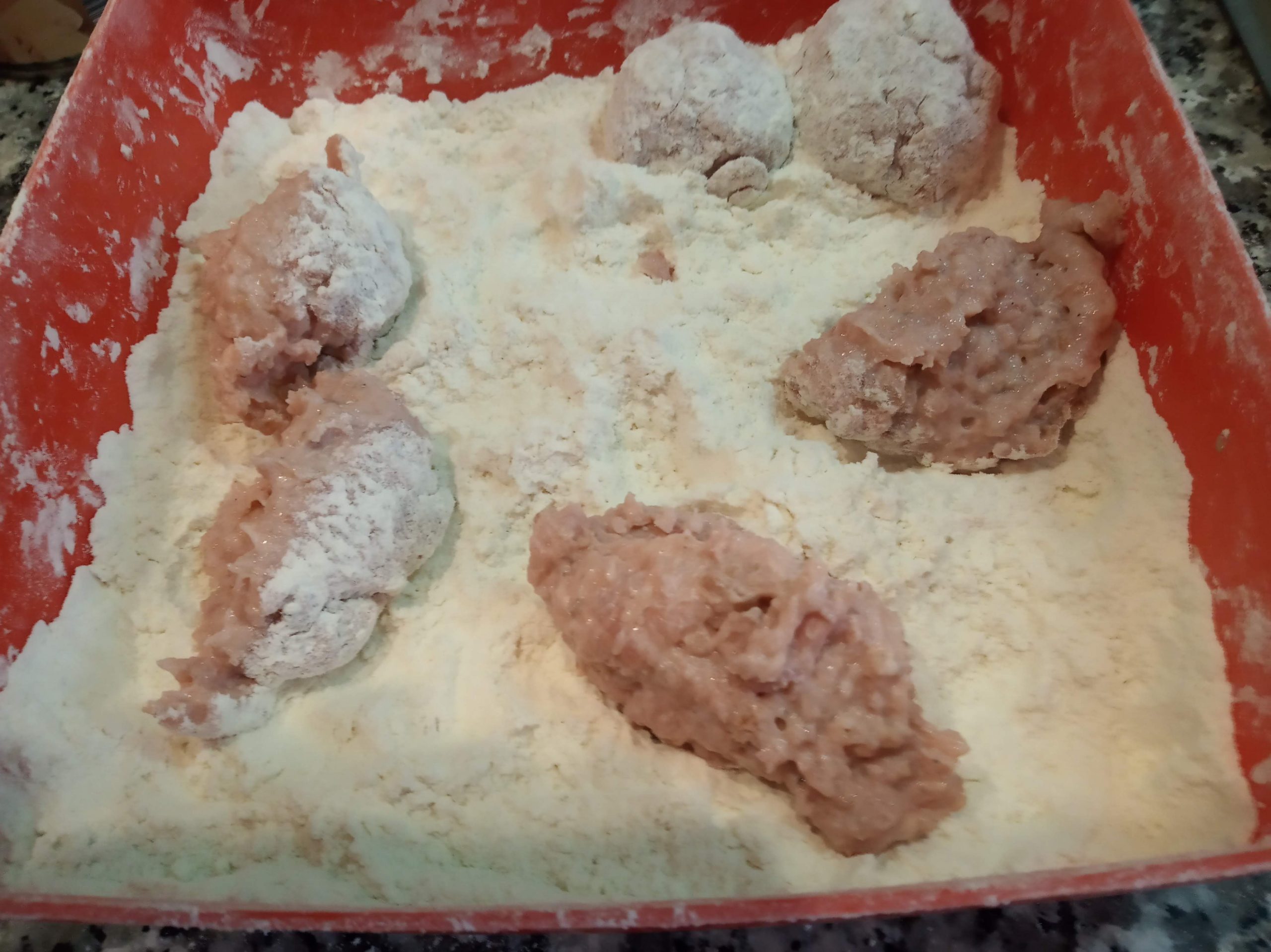 Sacar la masa y echar una cucharada en la harina, o dos si las quieres más gordas, y hacer bolas, yo suelo ponerlas en un colador, para quitarles el exceso de harina, y luego las fríes en la sartén o freidora, hasta que estén doraditas por todos los lados, reservar en un plato.
