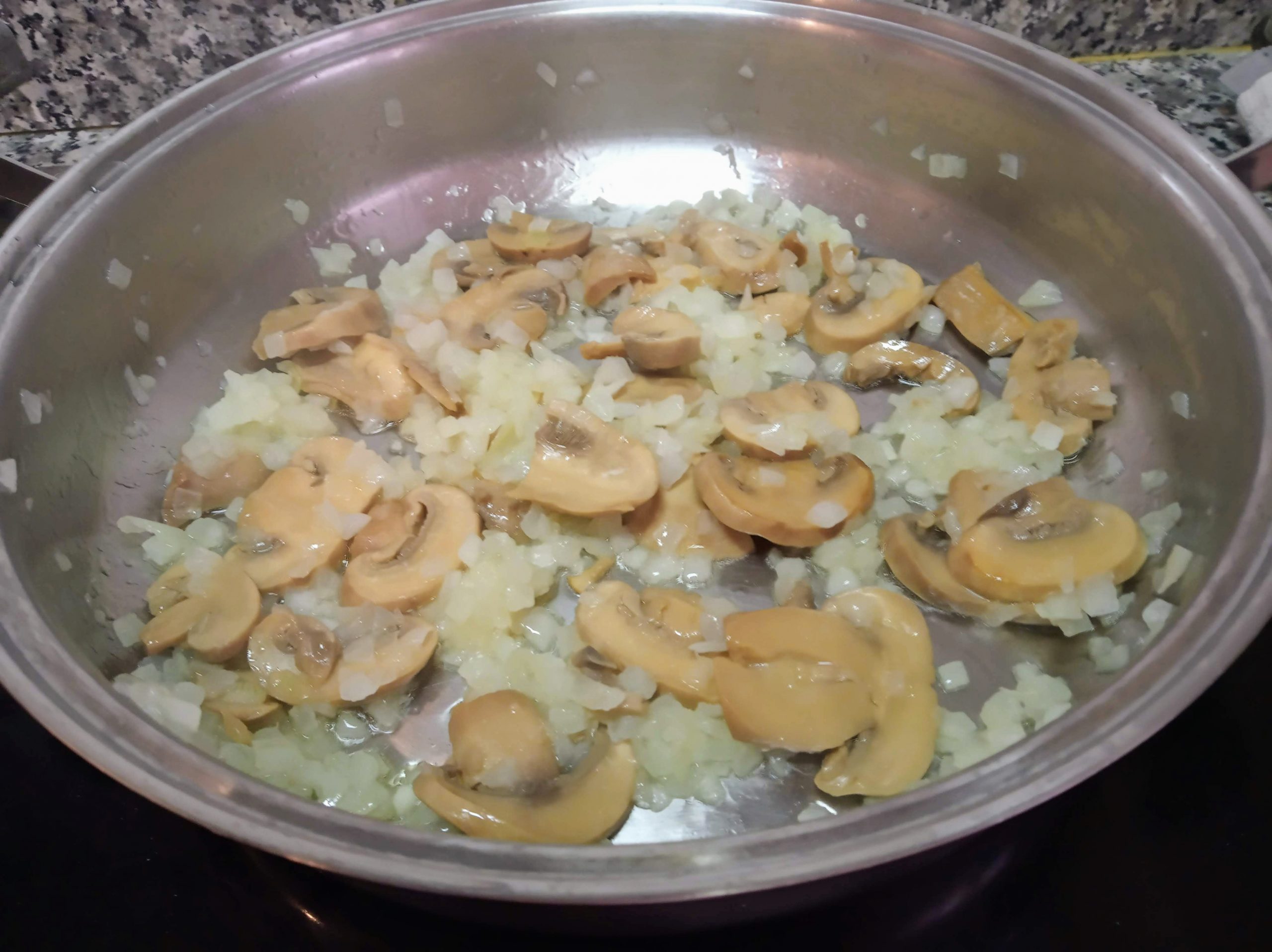 En una cacerola baja y amplia, echamos un poco de aceite y refreímos la cebolla troceada, con un poco de sal, añadimos los champiñones laminados fresco o de lata y refreír todo junto, añadir el laurel y la salsa de tomate casera.