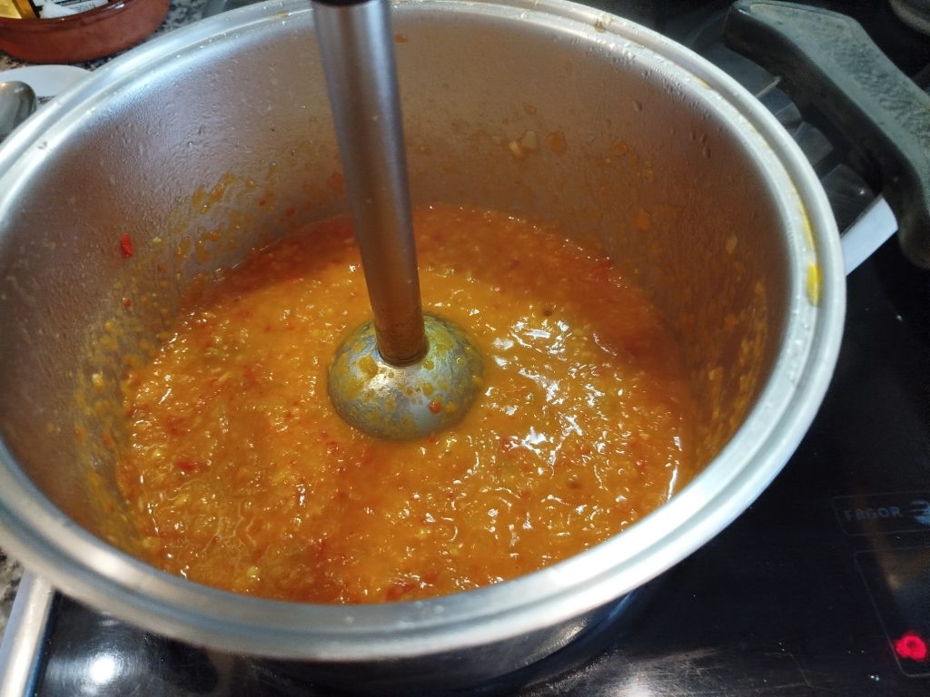 Luego retiramos la hoja de laurel, y pasamos la minipimer, y triturar todo muy bien.