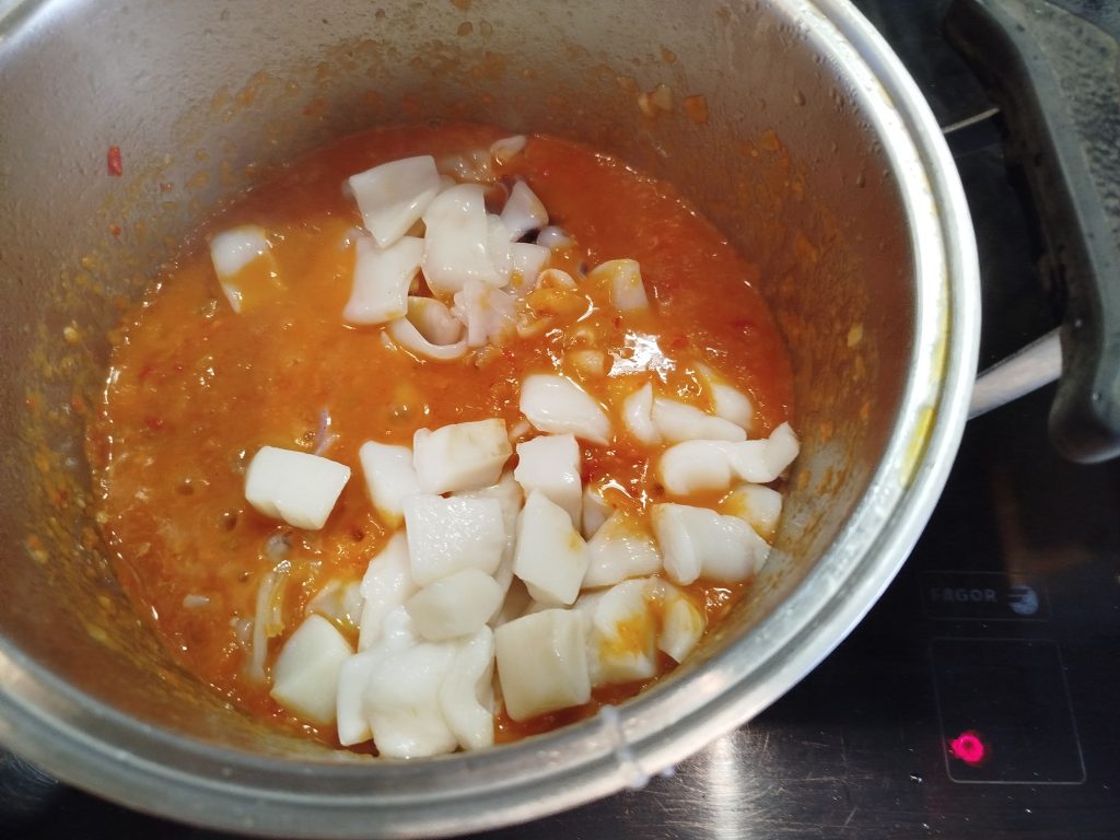 Dejar cocer unos 25 o 30 minutos, probar de sal y si está el calamar y el choco, tierno.