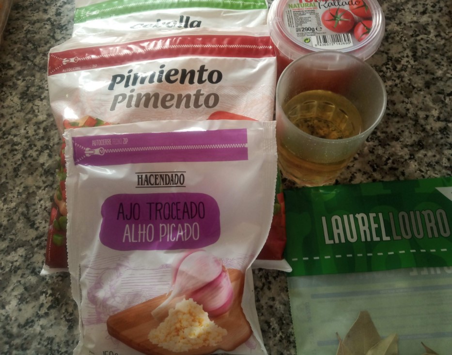 - 1 cebollas, 1 pimientos rojos y verde, 2 dientes ajo fresco o congelado