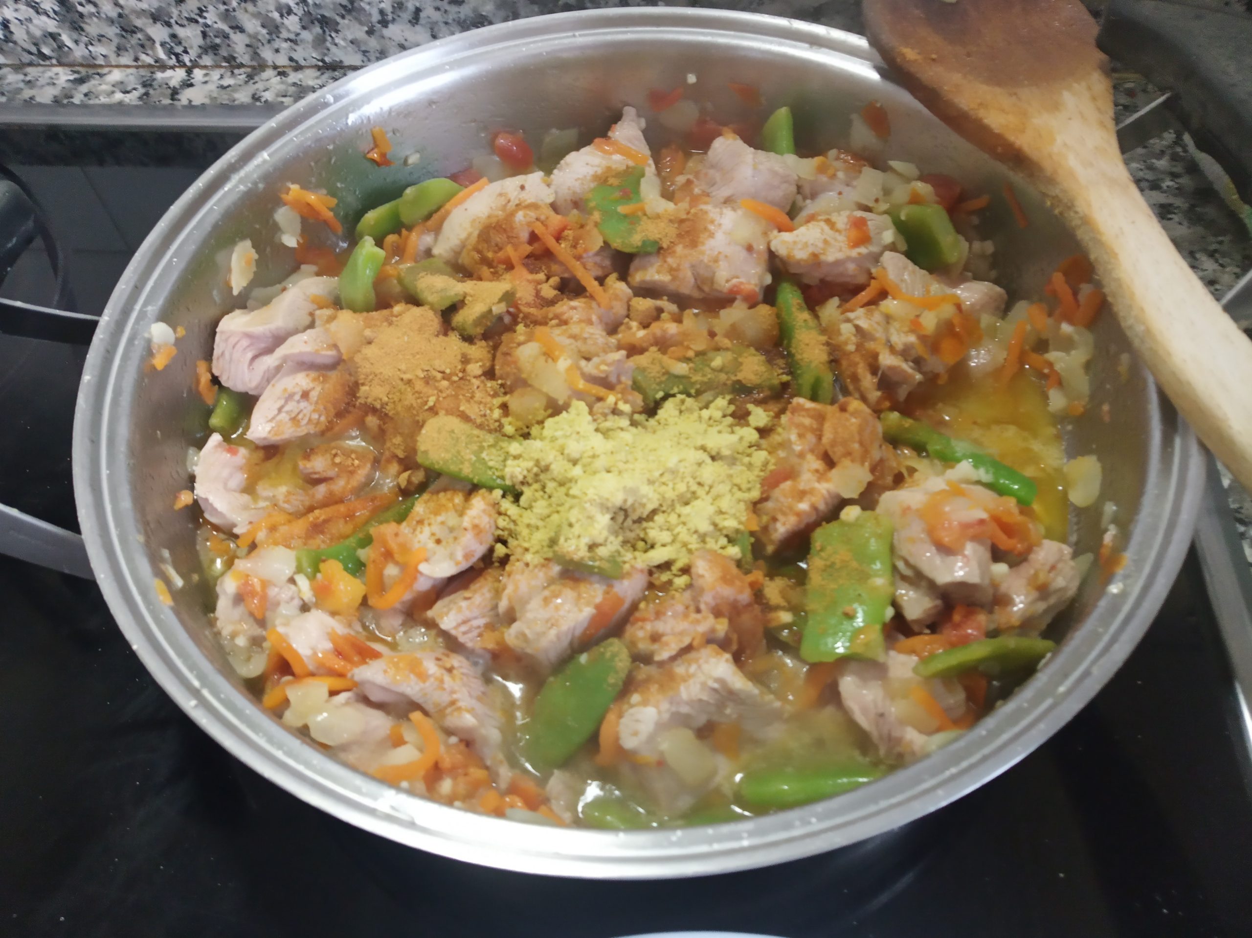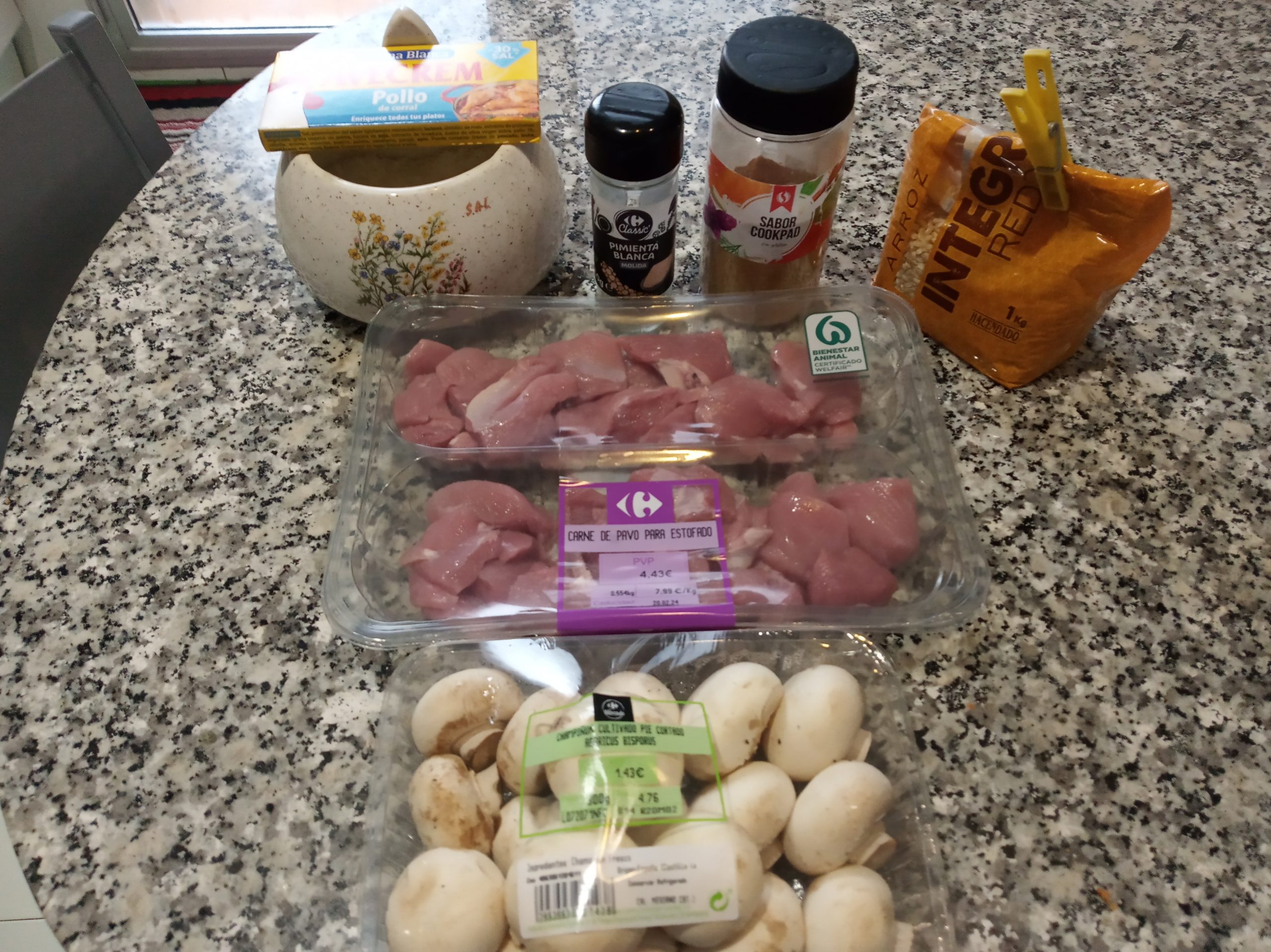 Añadimos el arroz cocido, puedes descongelarlo antes en el Microondas, añadir si hace falta más agua y dejar cocer a fuego suave, de 6 al 1, durante otros 15 minutos, probar que el pavo este tierno, y bien de sal.