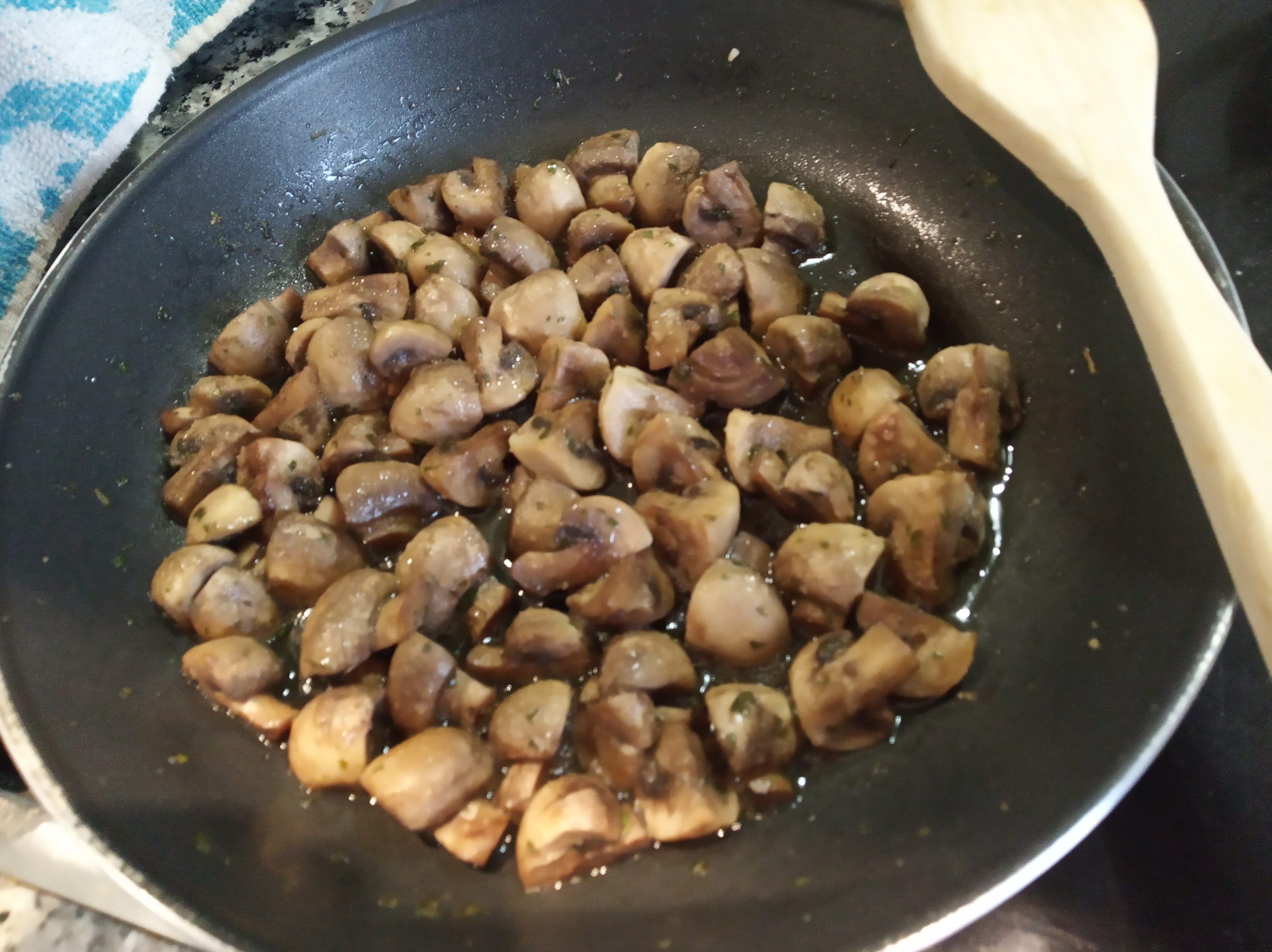 En una cacerola grande baja, echamos un fondo de aceite, le añadimos las verduras troceadas, en mi caso sin champiñones por alergia, con un poco de sal, cuando el ajo empiece a hervir, mezclamos toda la verdura, y dejarla hacer uno 7 o 10 minutos. Puedes echarle, los champiñones troceados en cuartos, junto a la verdura.