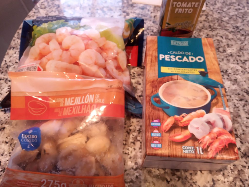 Descongelar las gambas y los mejillones, estos verificar que no tiene, hierba dentro, para dejarlos bien limpios.