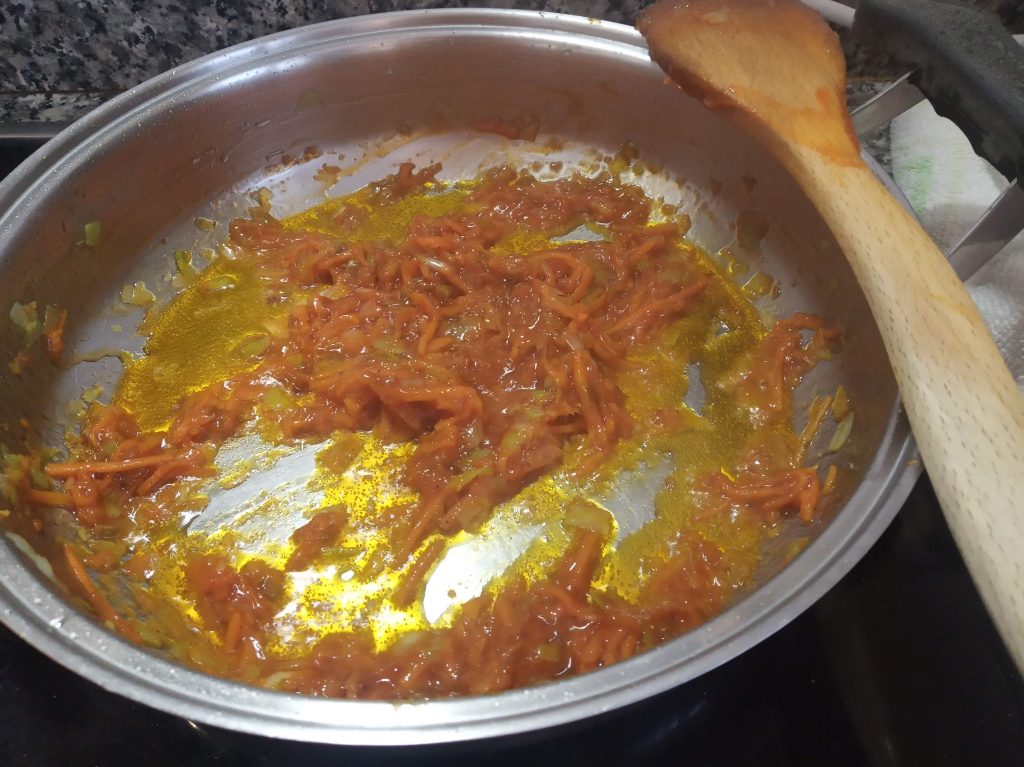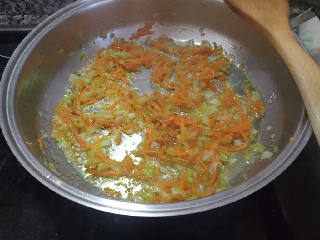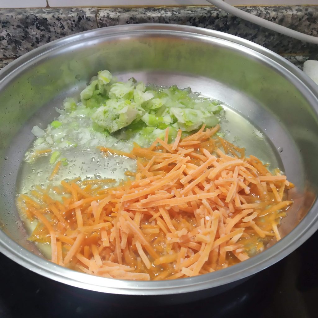 En una sarten grande o cacerola baja, echar un poco de aceite, el puerro picado y la zanahoria rallada o picada también, añadir un poco de sal.