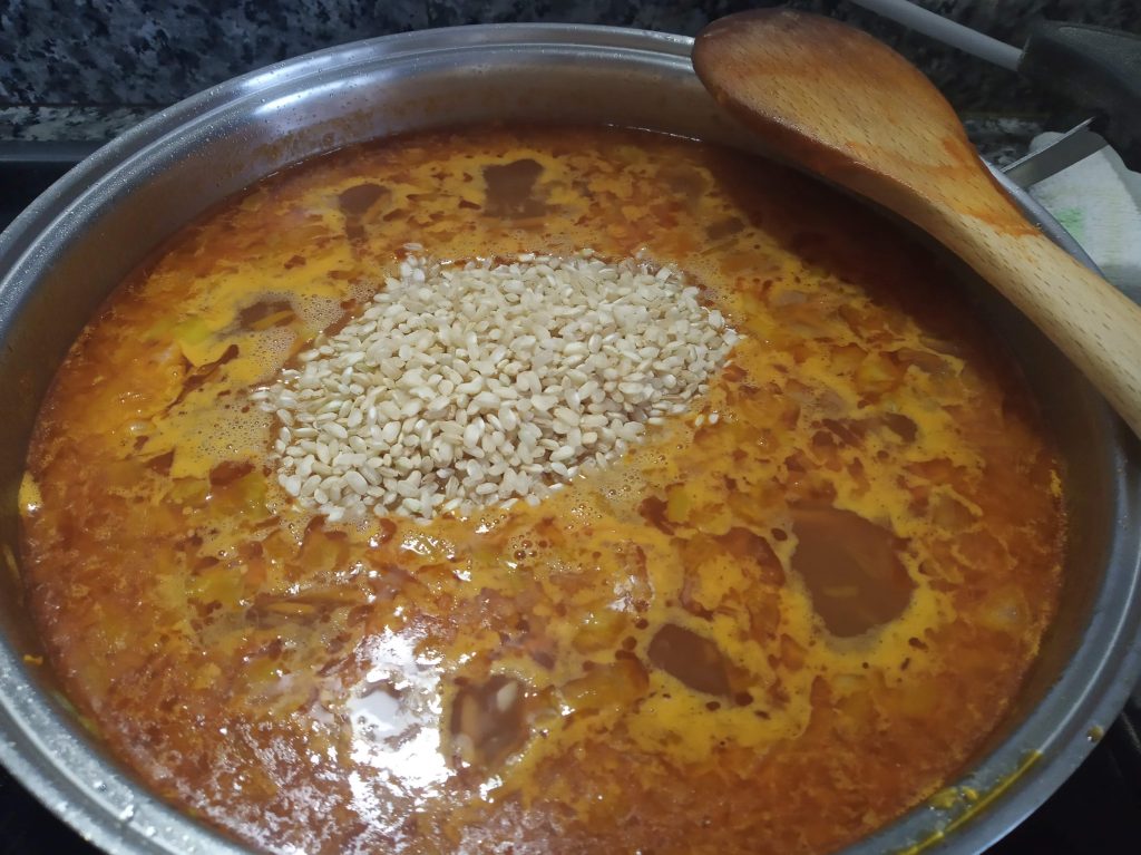 Cuando empiece a hervir, añadir el arroz, mezclar bien y bajar un poco la temperatura, dejándolo cocer durante 20 minutos.