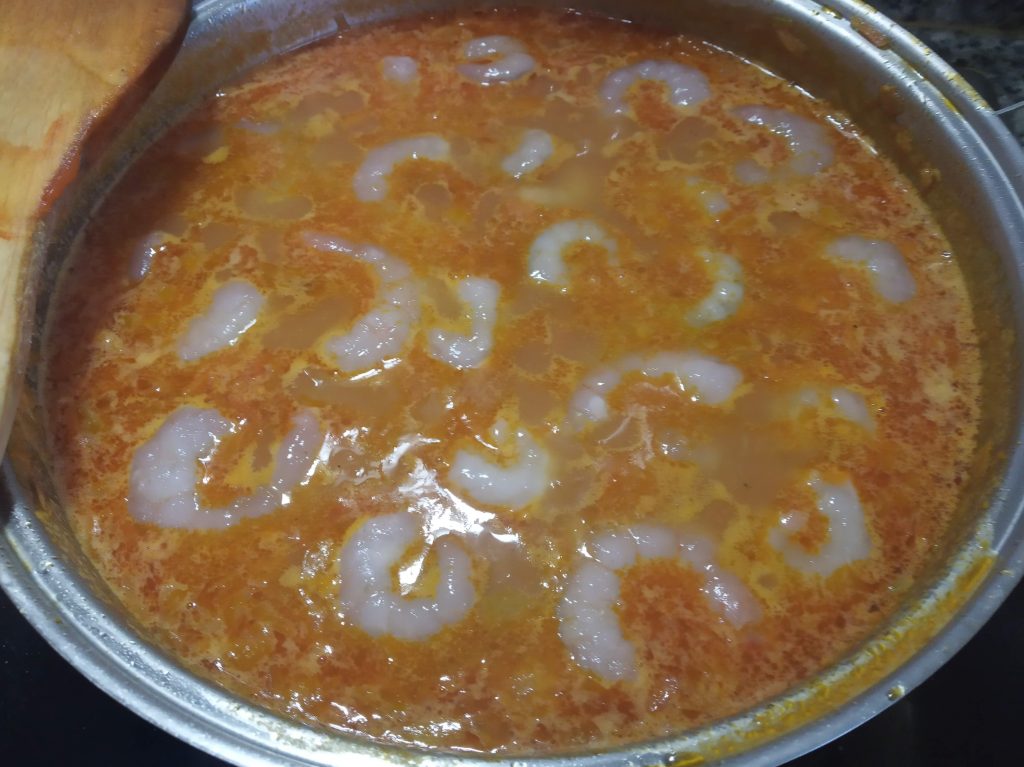 Después añadir las gambas, mezclar y dejar cocer otros 10 minutos.