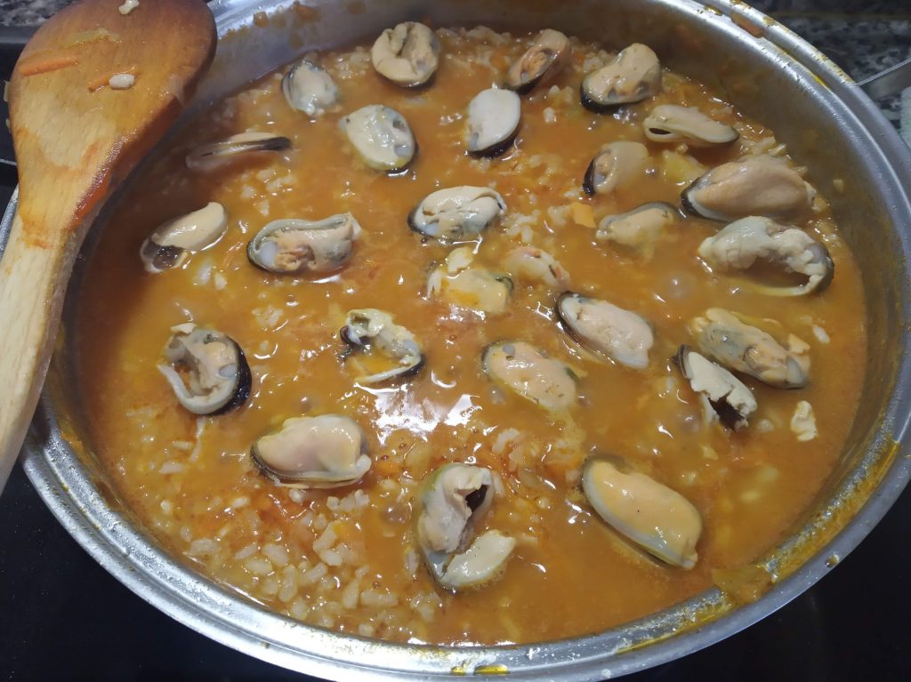 Al final repartir los mejillones, que están cocidos, para atemperarse, apagar y esperar 5 minutos para servirlo.