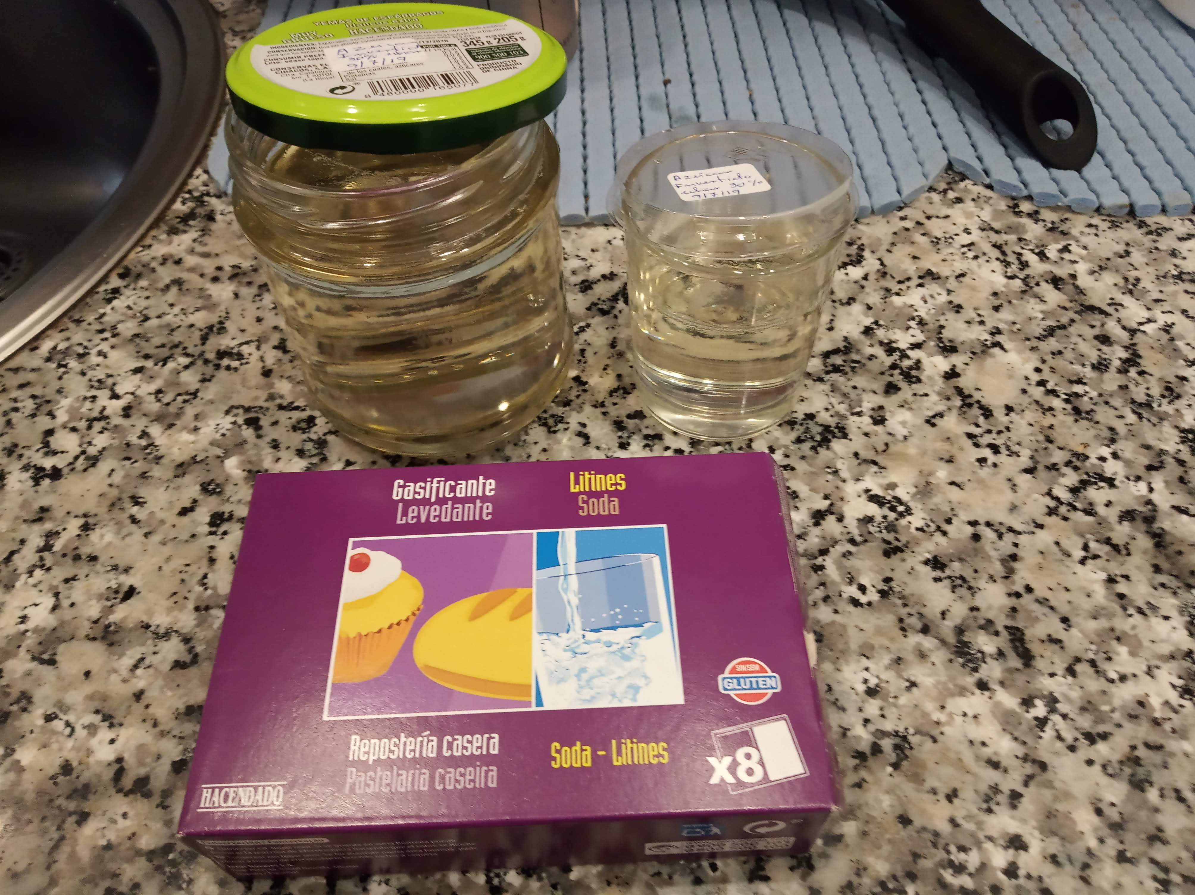 Dejamos que aumente la temperatura sin que llegue a hervir, ni a los 100ºC, y añadimos el sobre del ácido (blanco), apagar el fuego y seguir removiendo un minuto más.