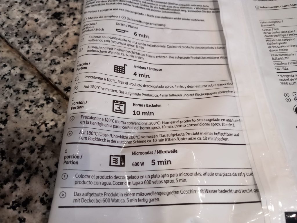 En la freidora (1 porción): Precalentar a 180°C. Freír el producto ultracongelado aprox. 4 min. y dejar escurrir sobre papel absorbente.
