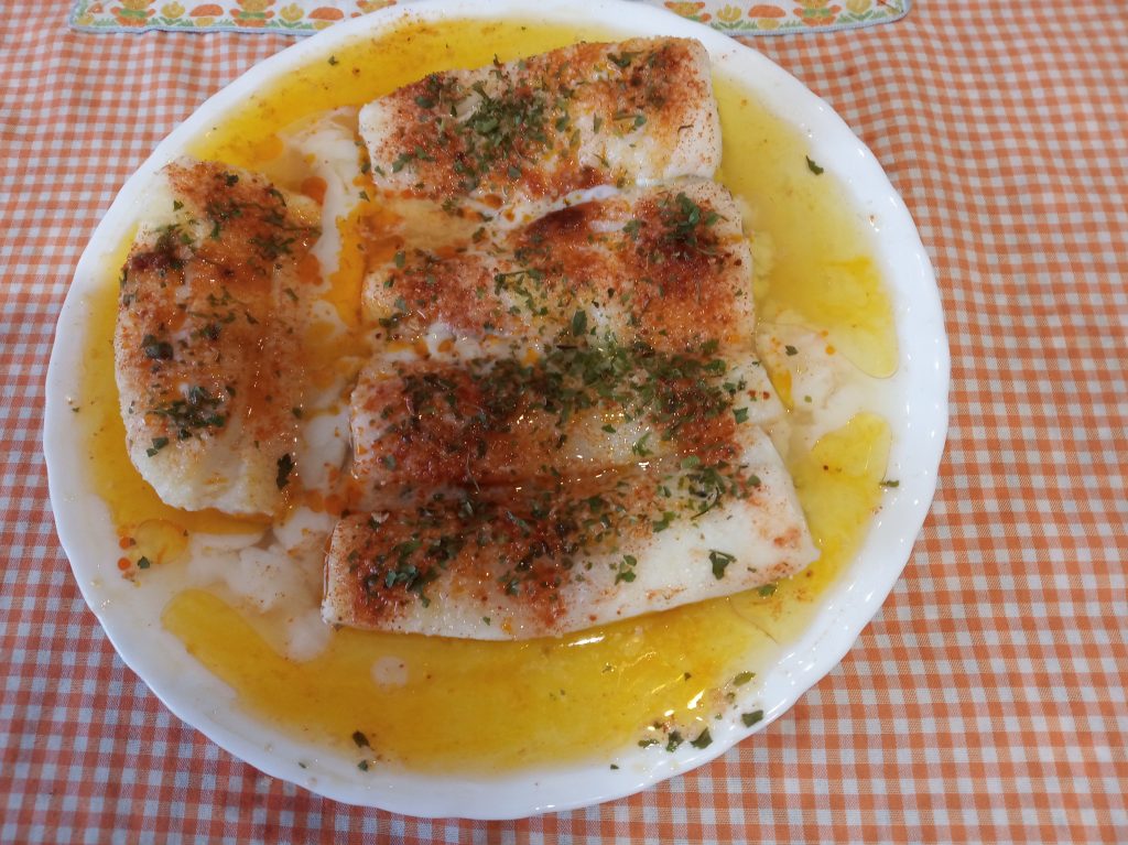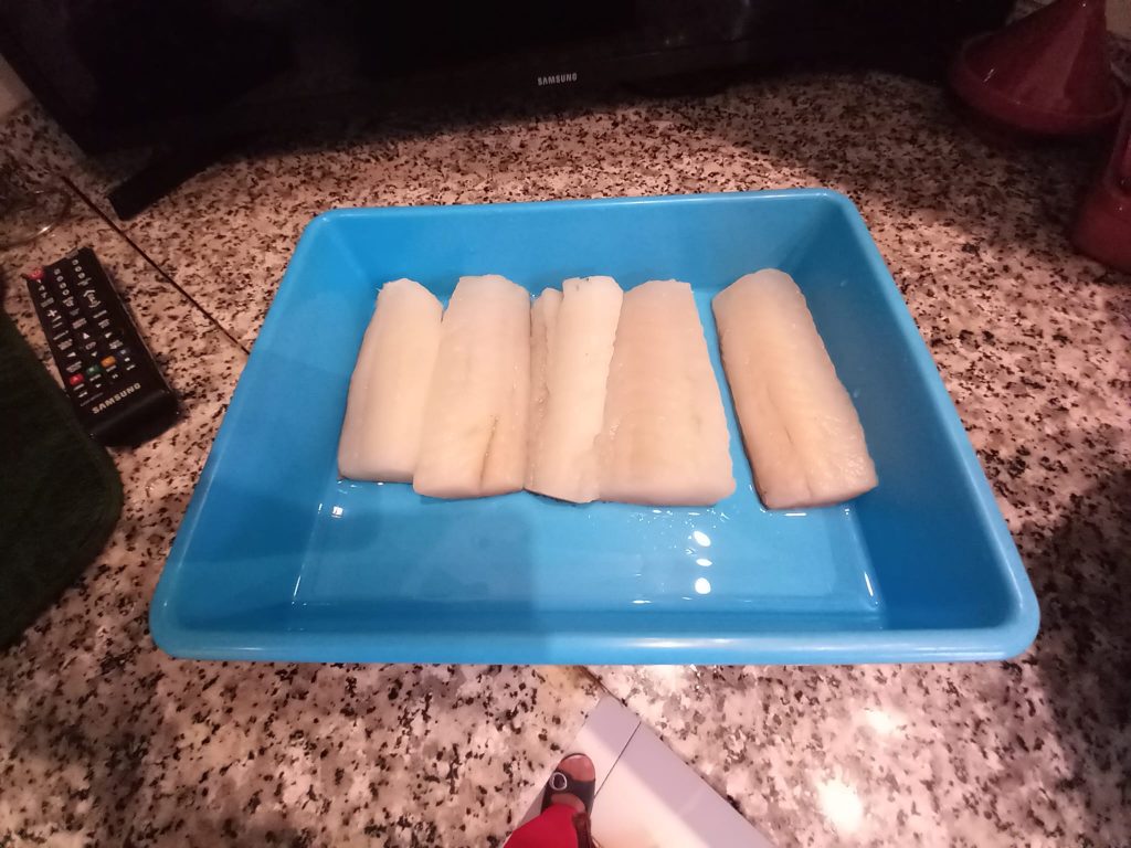 A la hora de comer, colocar los Lomos de bacalao, con la piel para abajo, en un plato NO, mejor una tartera redonda, que quepa en el Microondas, pues suelta un poco de agua.