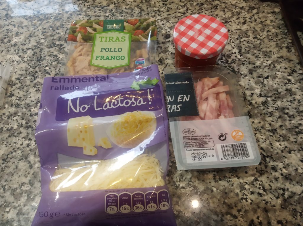 Añadir las tiras de pollo, de bacón y el queso rallado.