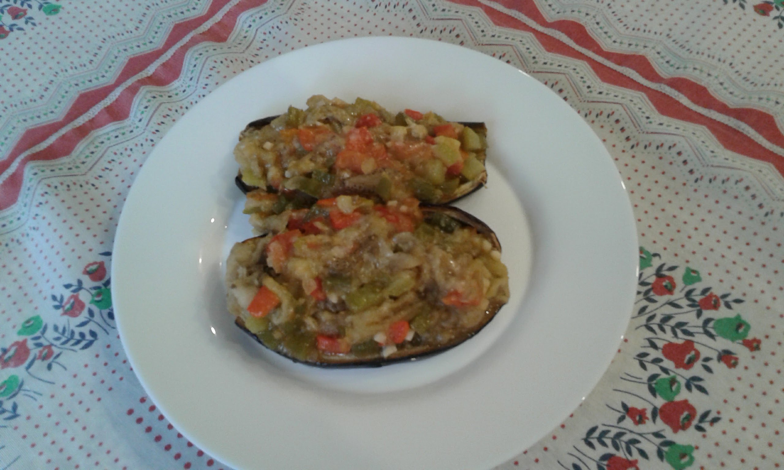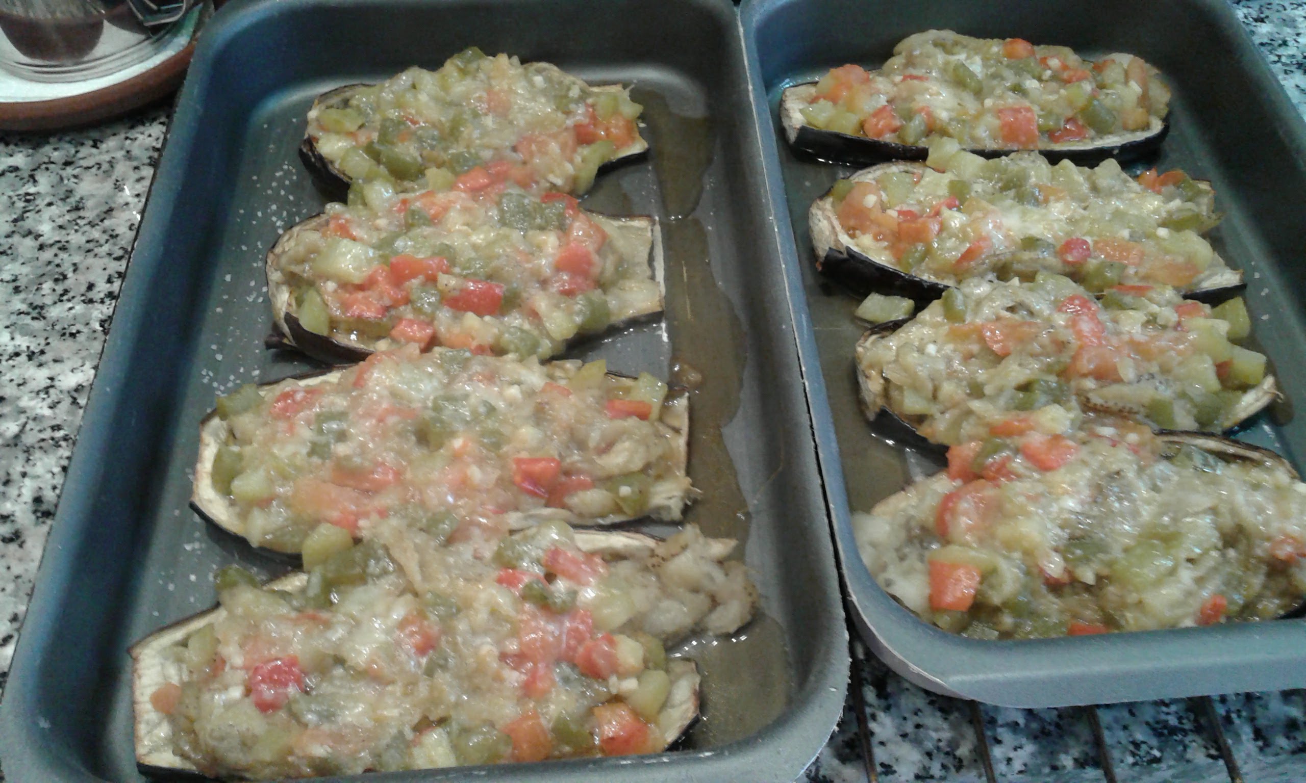 Llenar otra vez las berenjenas con la verdura, añadir queso rallado por encima y gratinar en el horno.