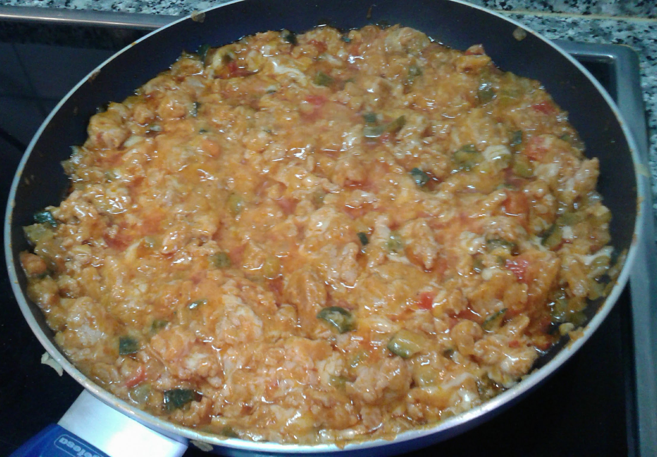 Sacamos las berenjenas del horno, y vaciamos cortándolo en trocitos pequeños y mesclar con el resto de la verdura.