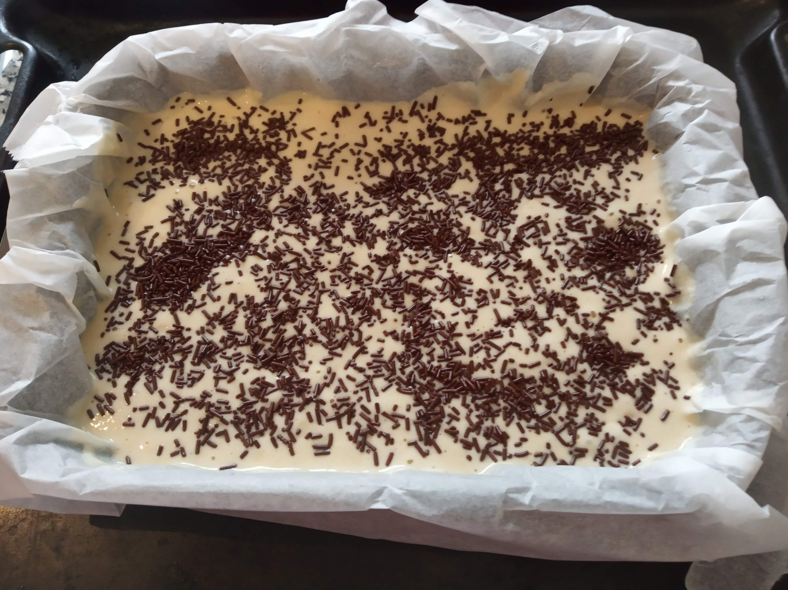 8. Decorar por encima con azúcar glass y virutas de chocolate.