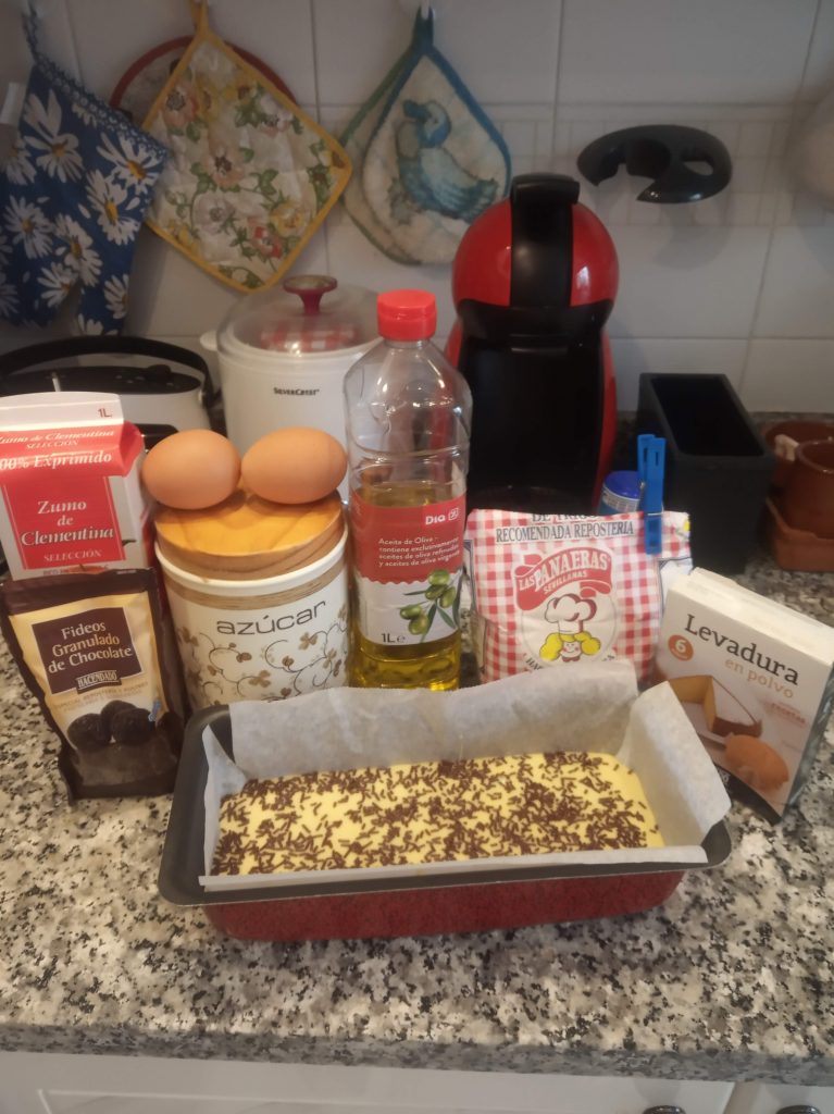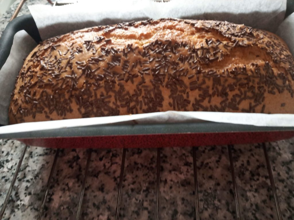 Mojar el molde con un poco de agua, y cubrir con papel de horno, echar la mezcla y dar unos golpes para quitar las burbujas, decorar por encima con fideos de chocolate o azúcar, tú decides.