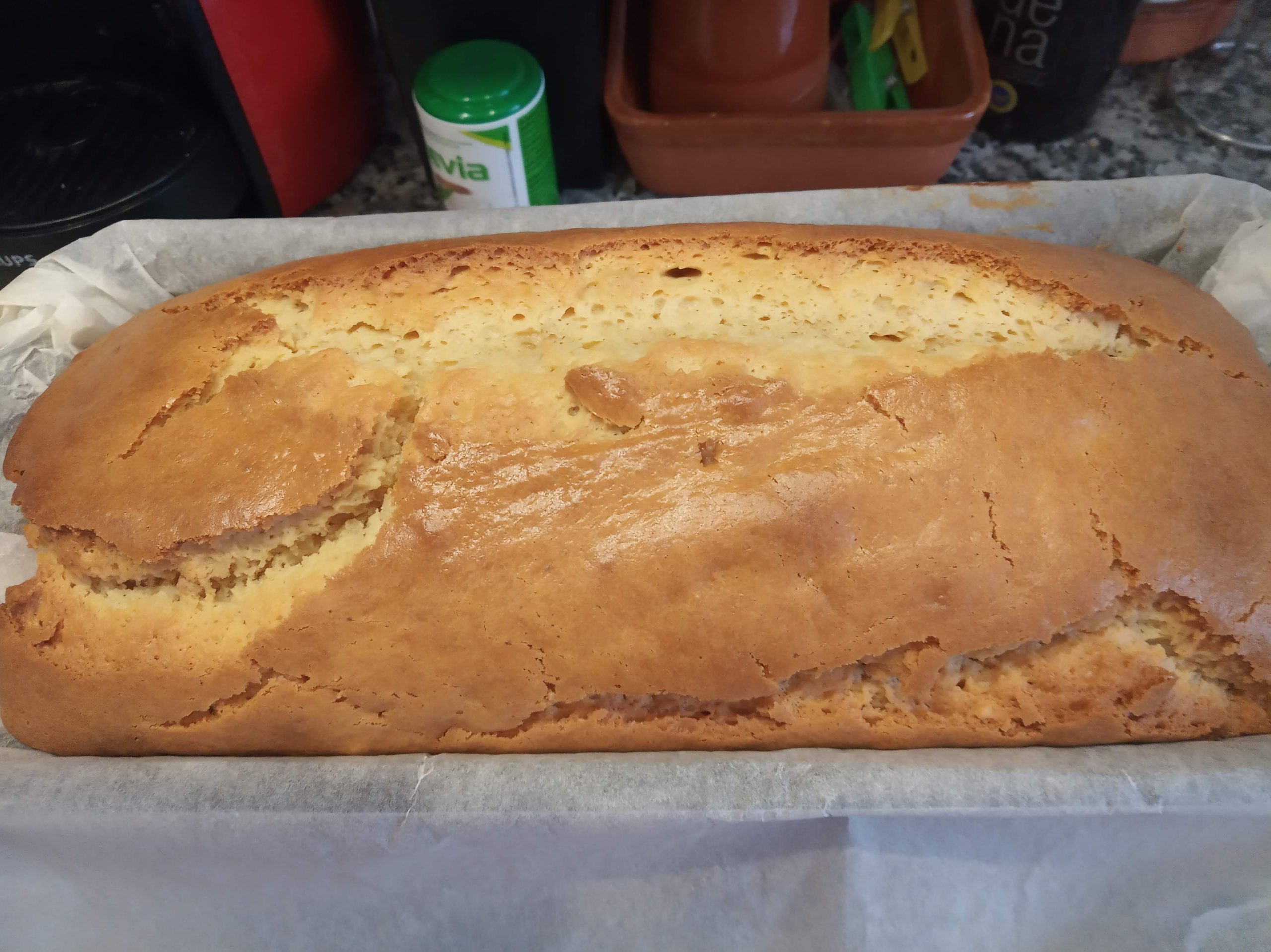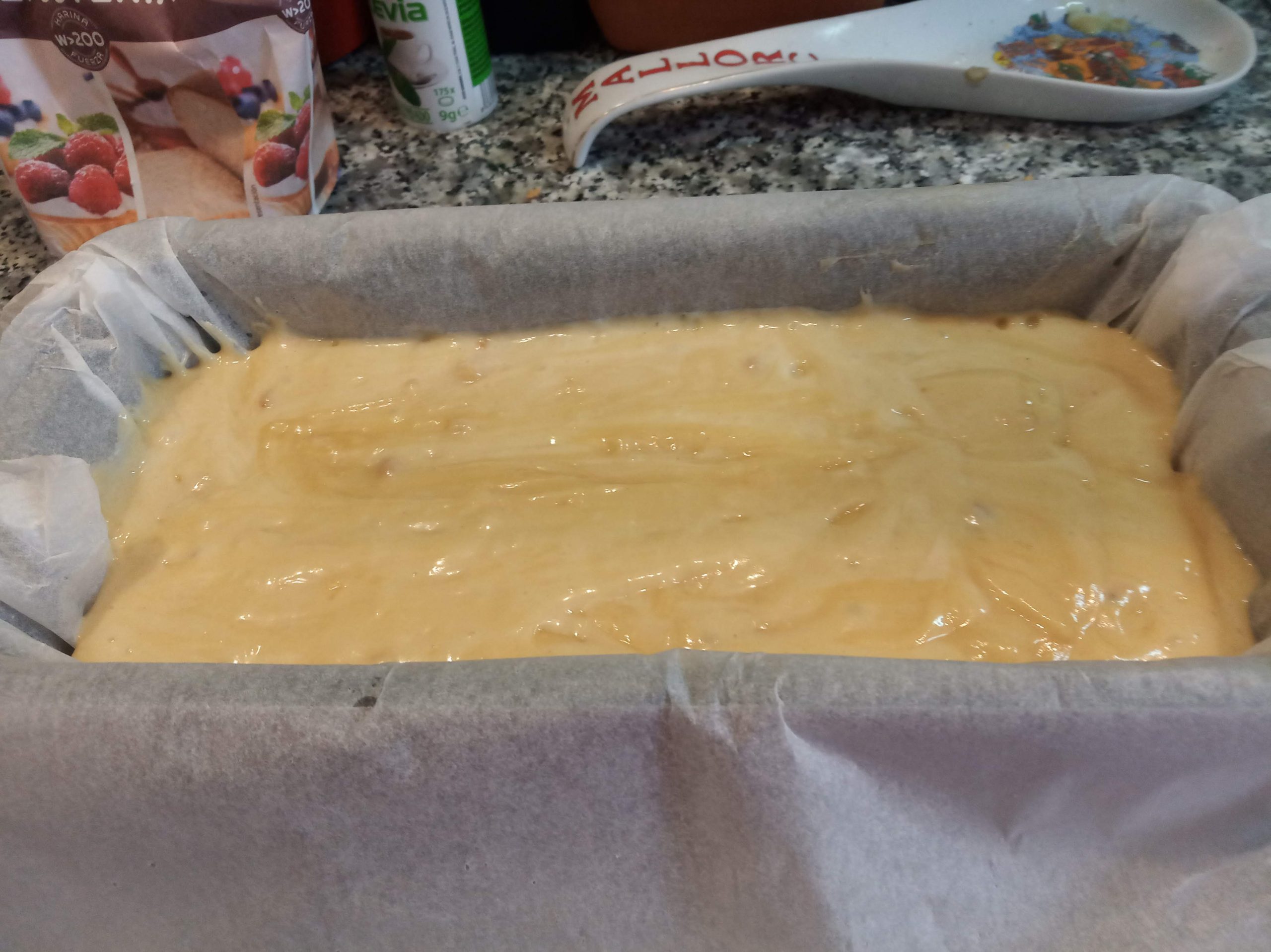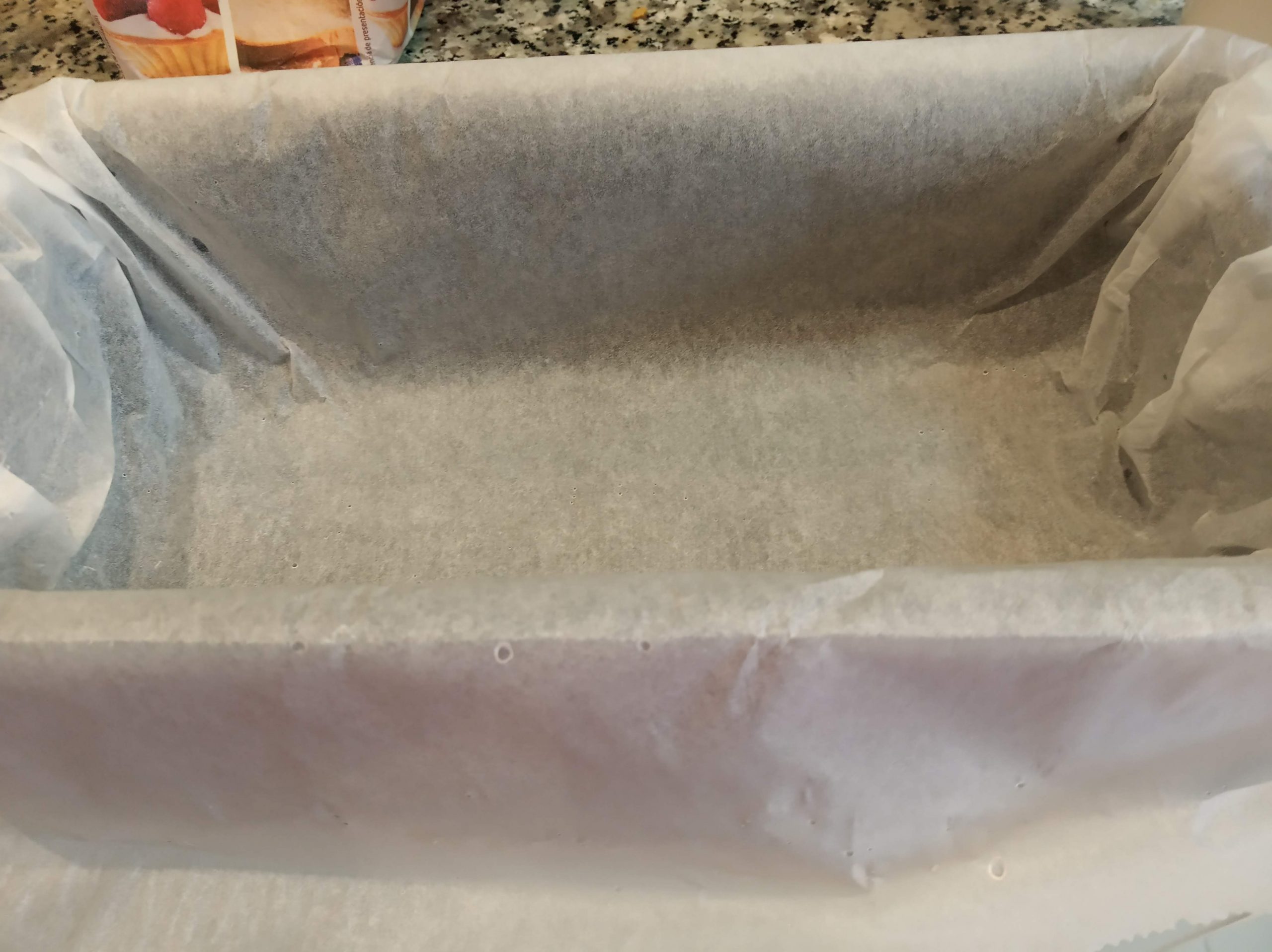 En un recipiente redondo o rectangular untado de mantequilla o forrado con papel de horno, en este caso mojar el recipiente y así el papel se adhiere y no se mueve. Echamos la masa.