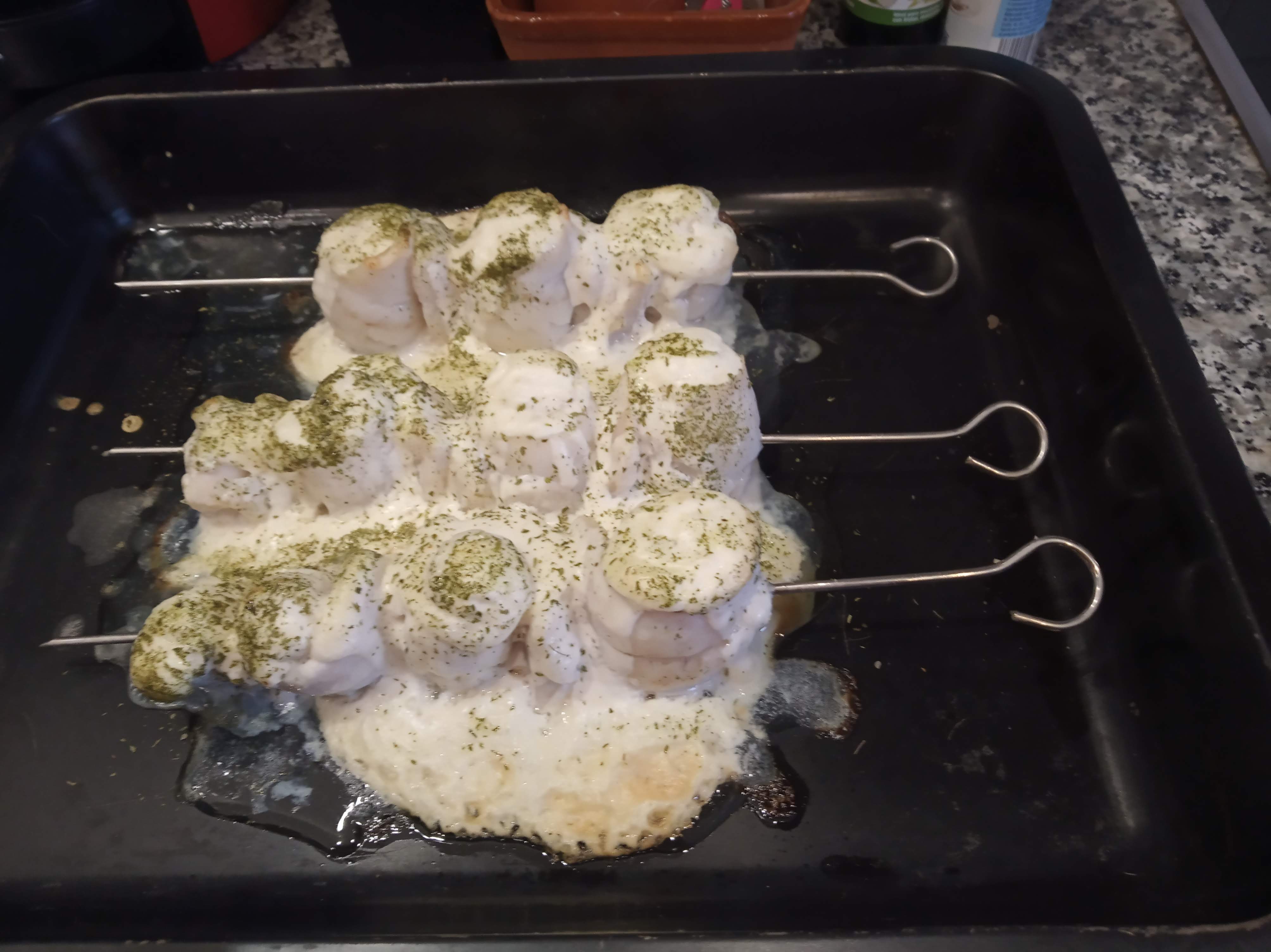 Poner las brochetas en una fuente para horno, con la parte abierta para arriba, y echar la salsa por encima y el perejil.