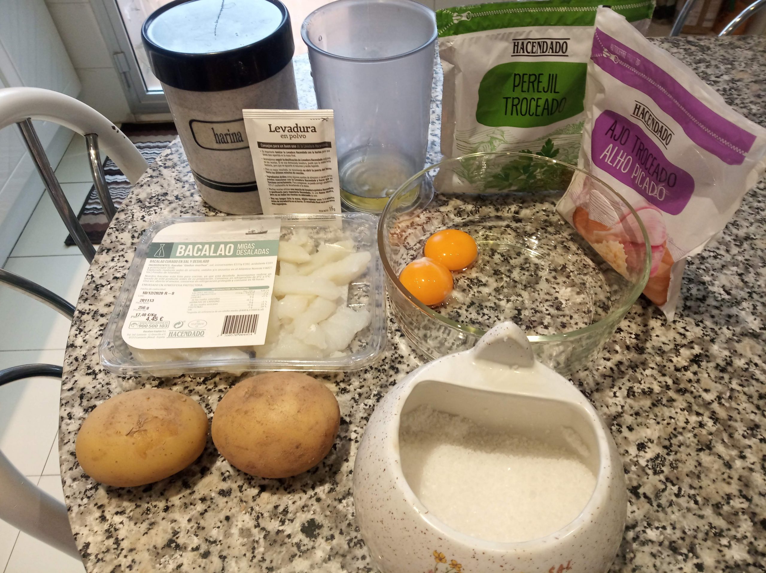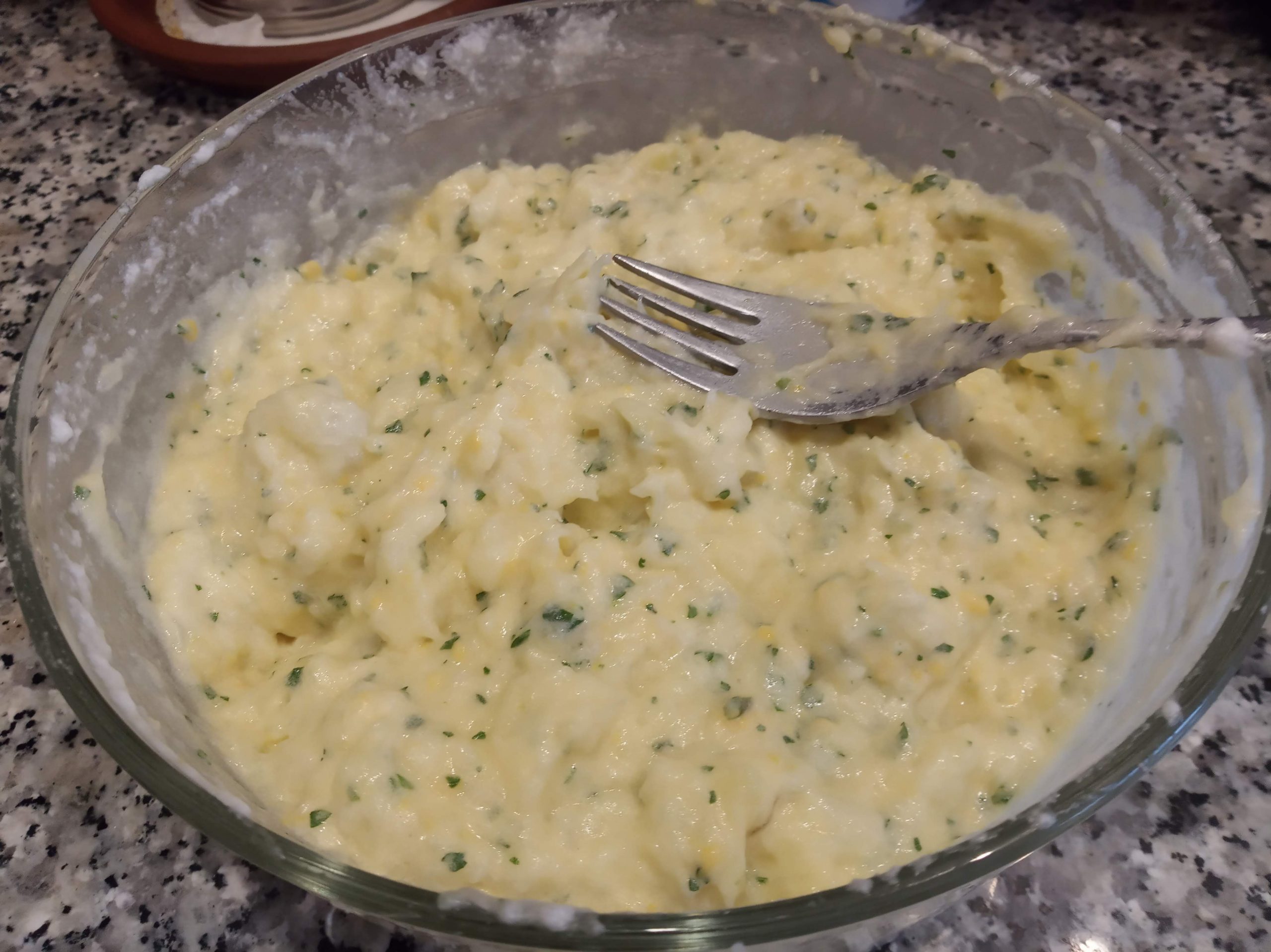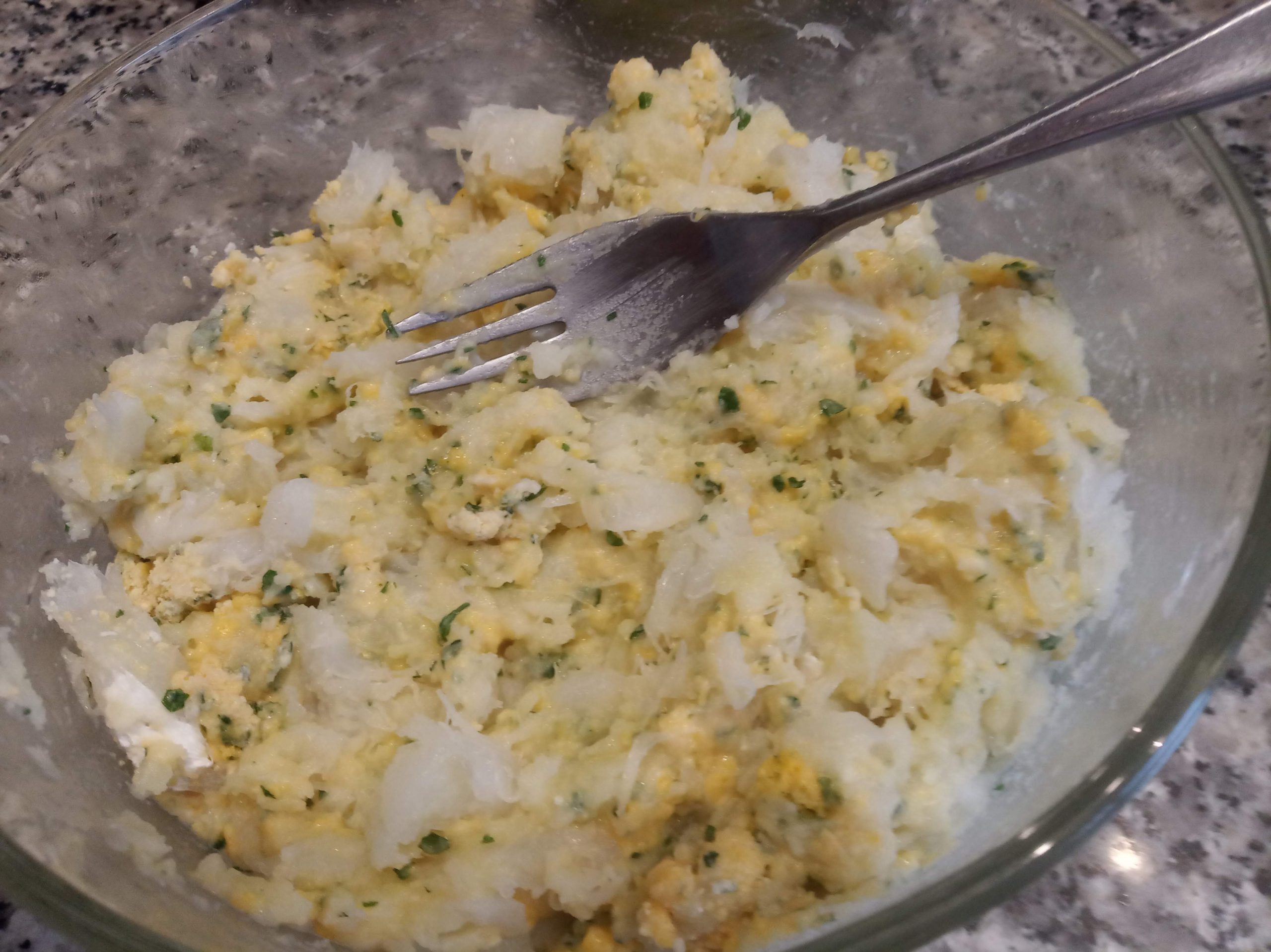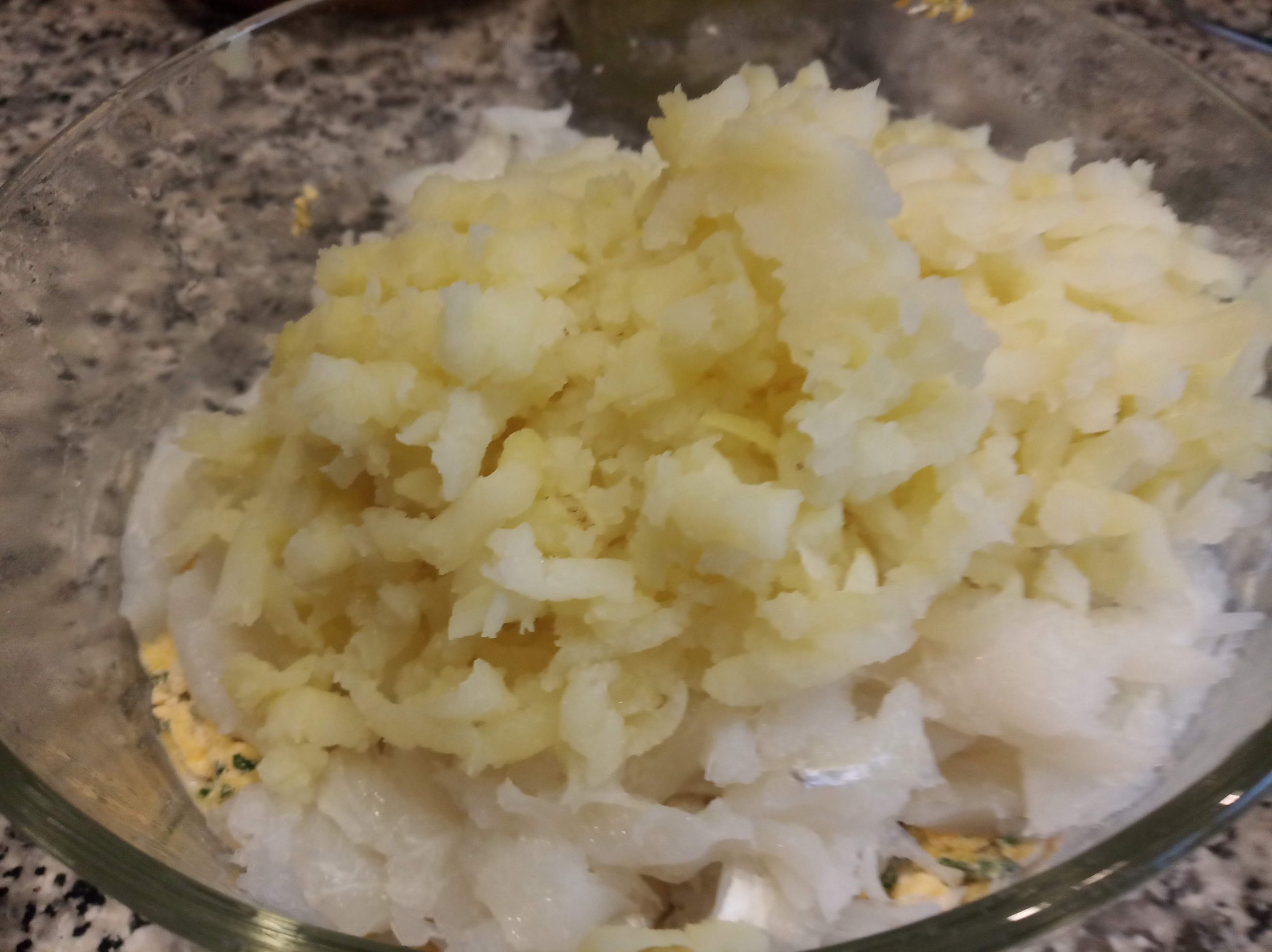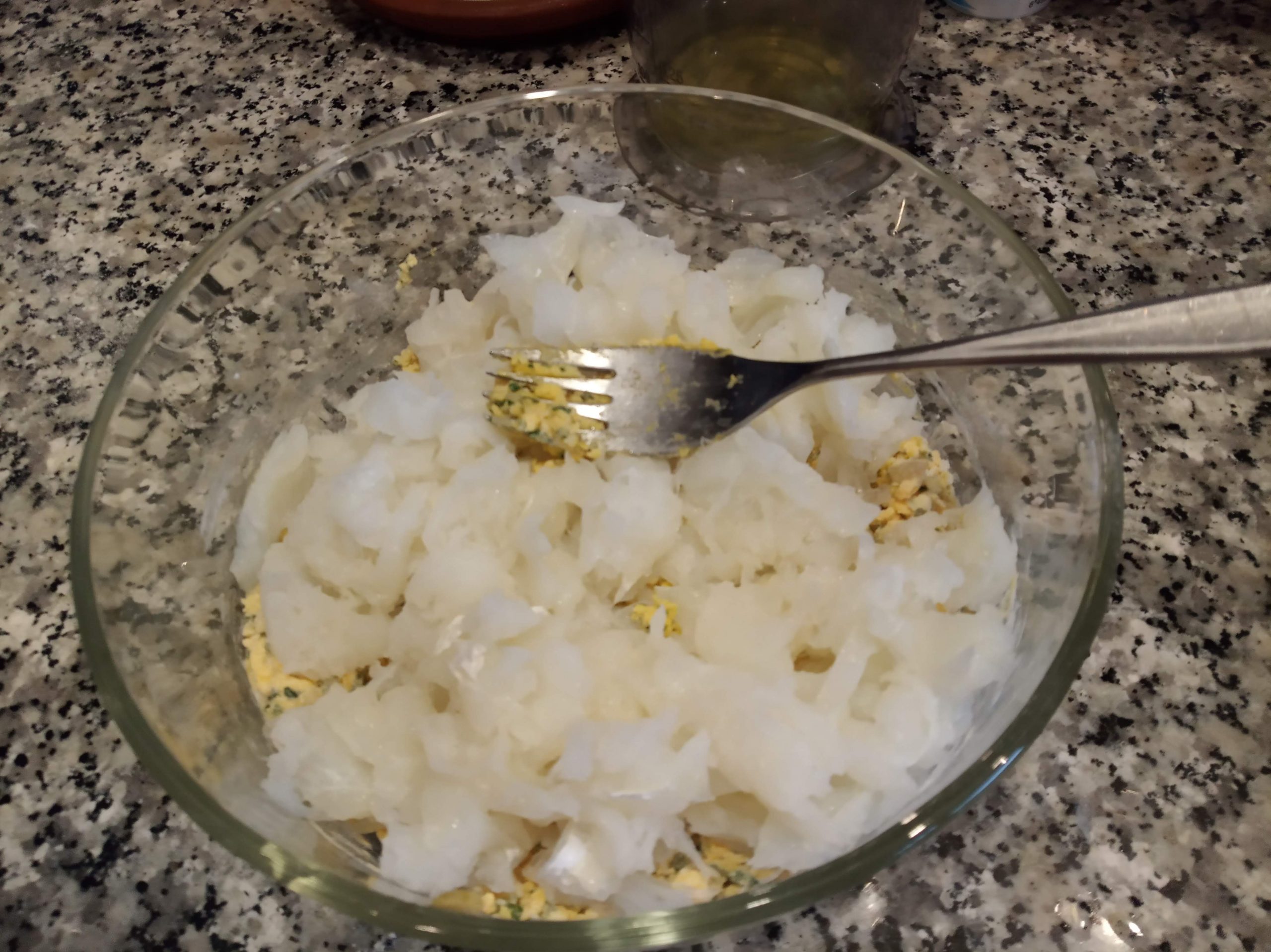 Una vez frías las patatas, pelarlas y rallarlas con un rallador grueso, añadir el bacalao, desmenuzado y sin espinas, remover y mezclar.