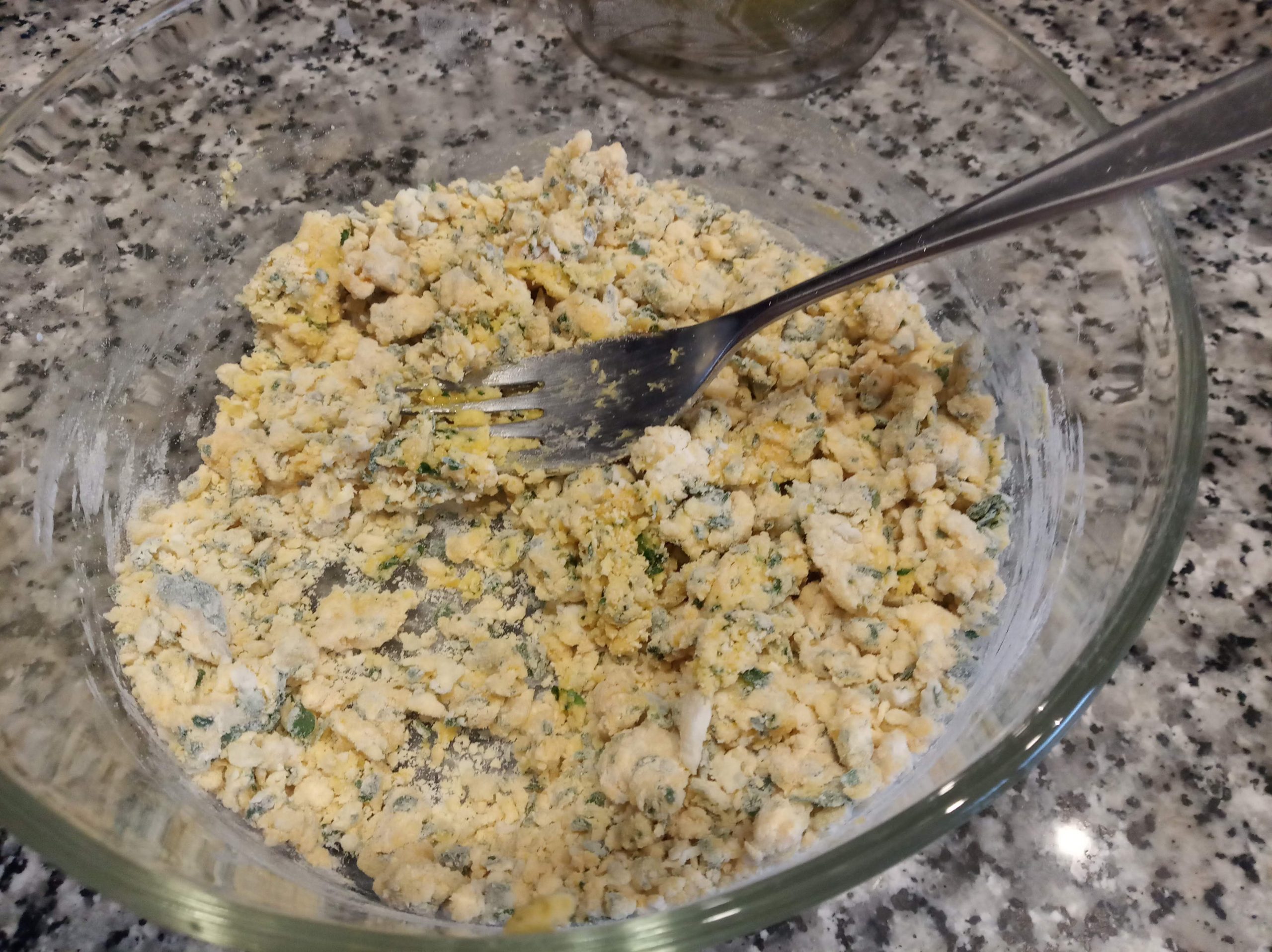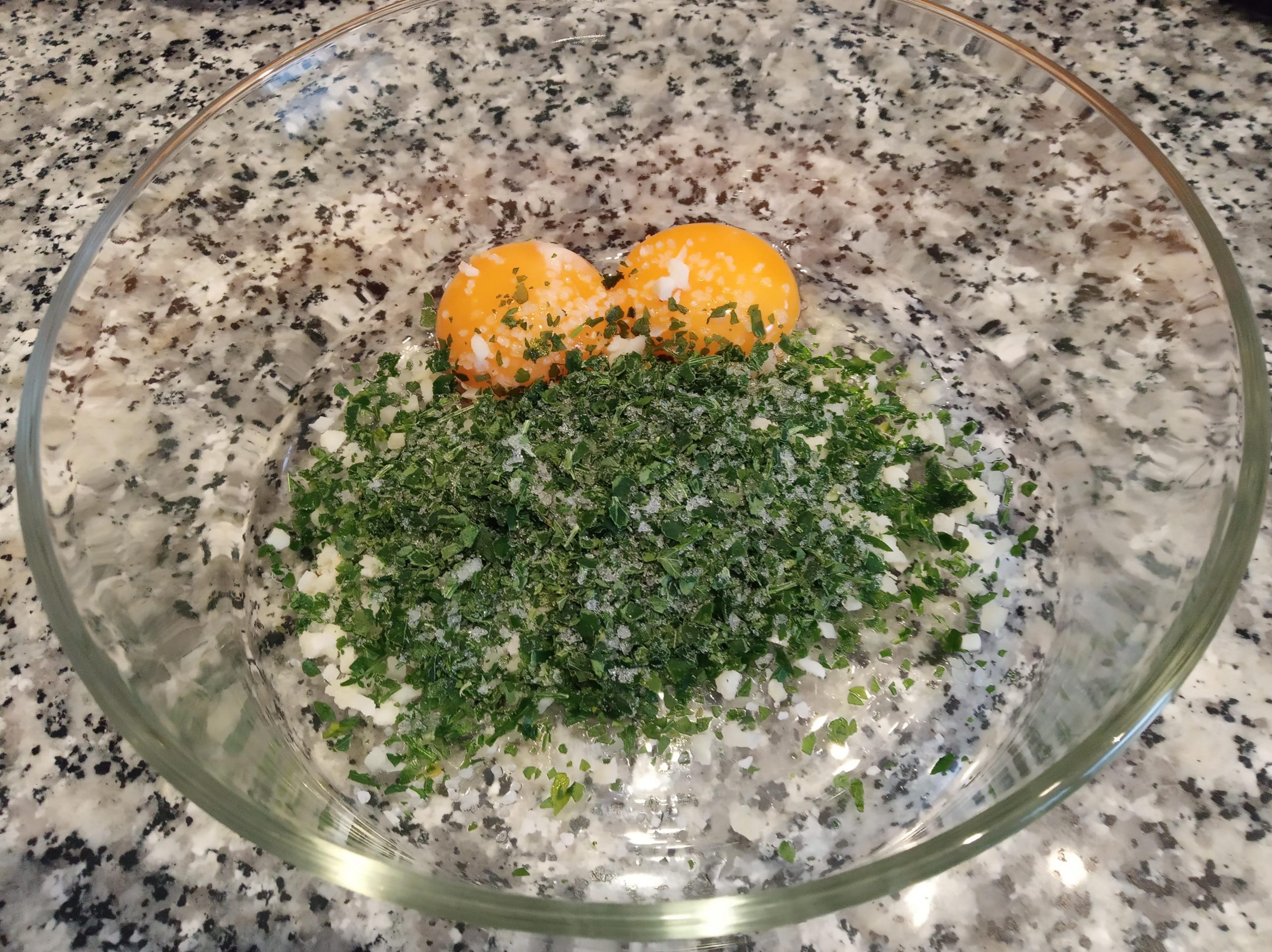 En un bol echamos los 2 huevos, reservando las claras, sal, perejil y ajo picado, la harina y la levadura, mezclar todo muy bien.