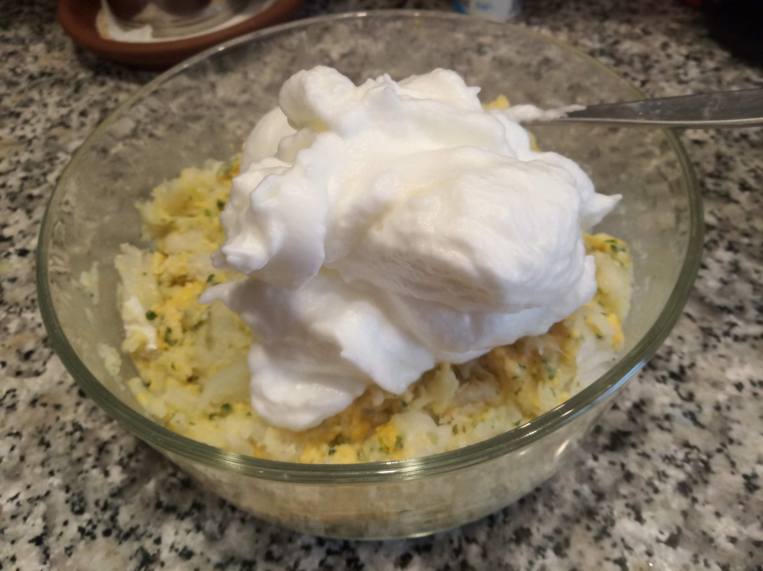 Añadir al bol donde tenemos el resto de ingredientes, mezclar todo muy bien. Montar las 2 claras de huevo, y añadir al resto con formas envolvente para que no se baje, y dejar reposar hasta la hora de hornearlo antes de comer. Si quieres puedes echarle 4 claras de huevos en vez de dos.