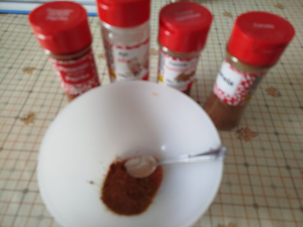 Echar en un cuenco, las especias, trocear el pollo hecho o fresco.