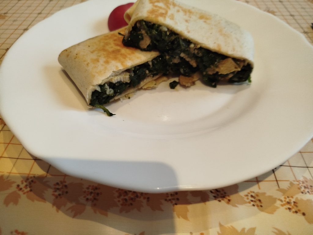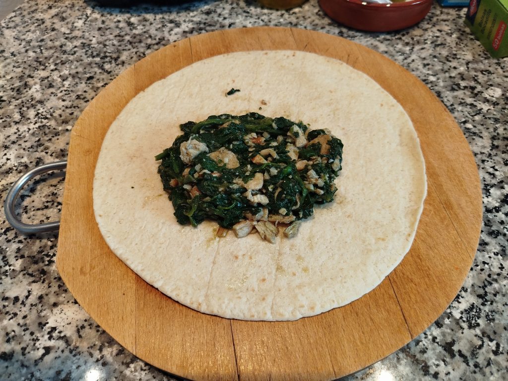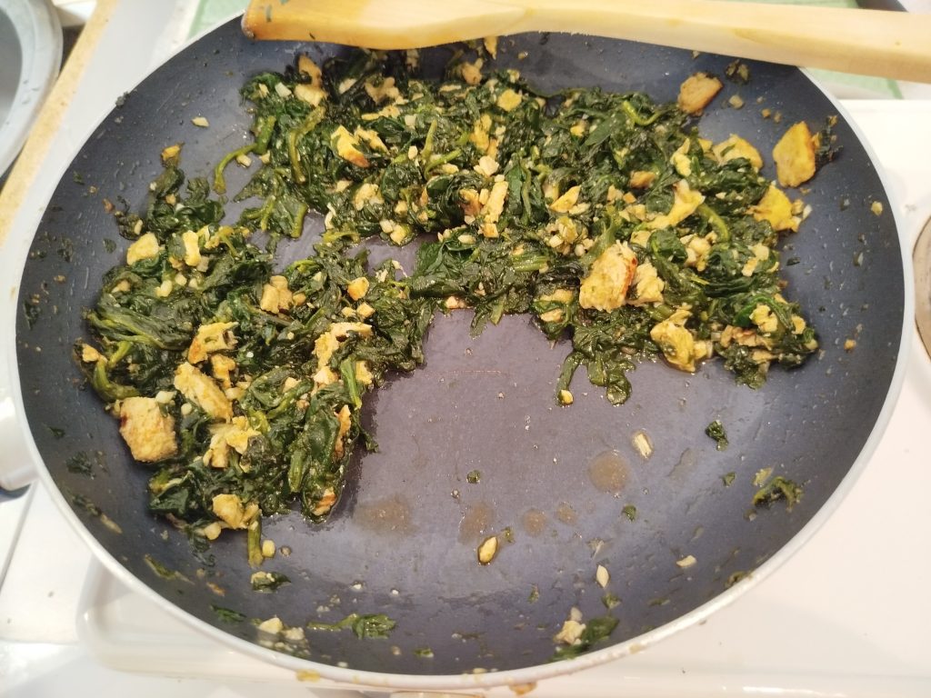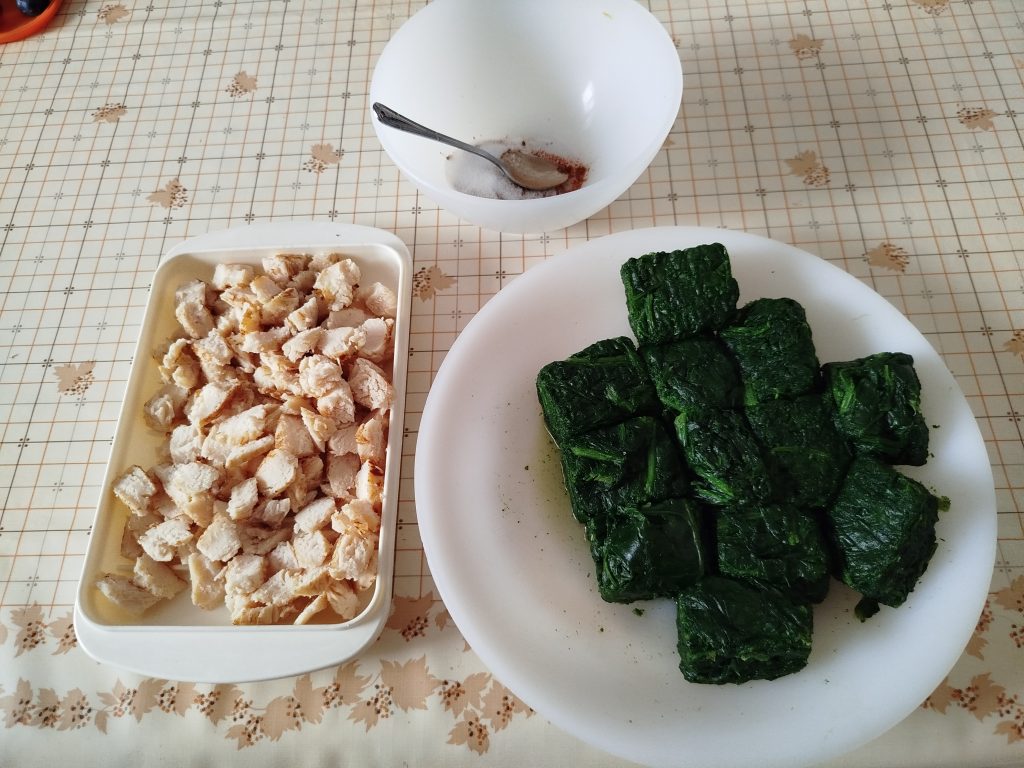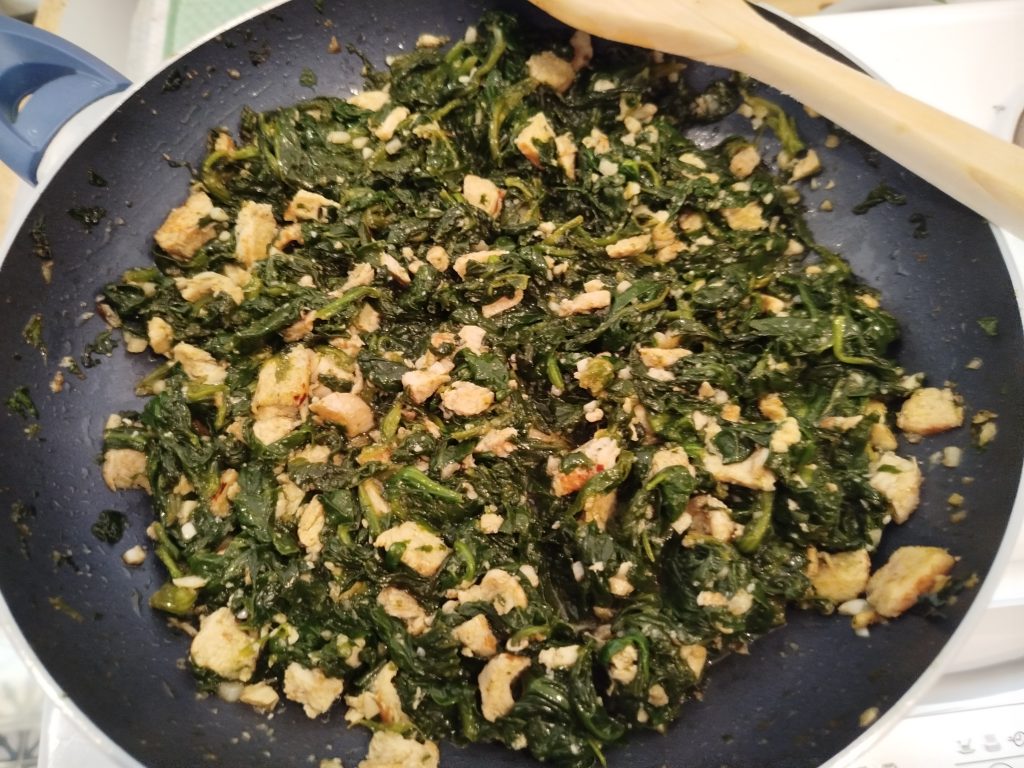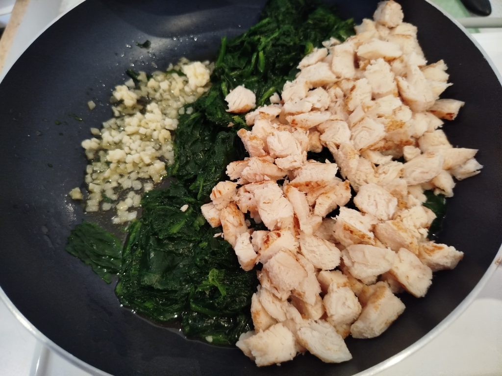 En una sarten, echar los ajos picados, las espinacas y el pollo troceado, cuando el ajo empiece a hervir, mezclar todo junto, y hacer hasta que el pollo, si es crudo este echo.
