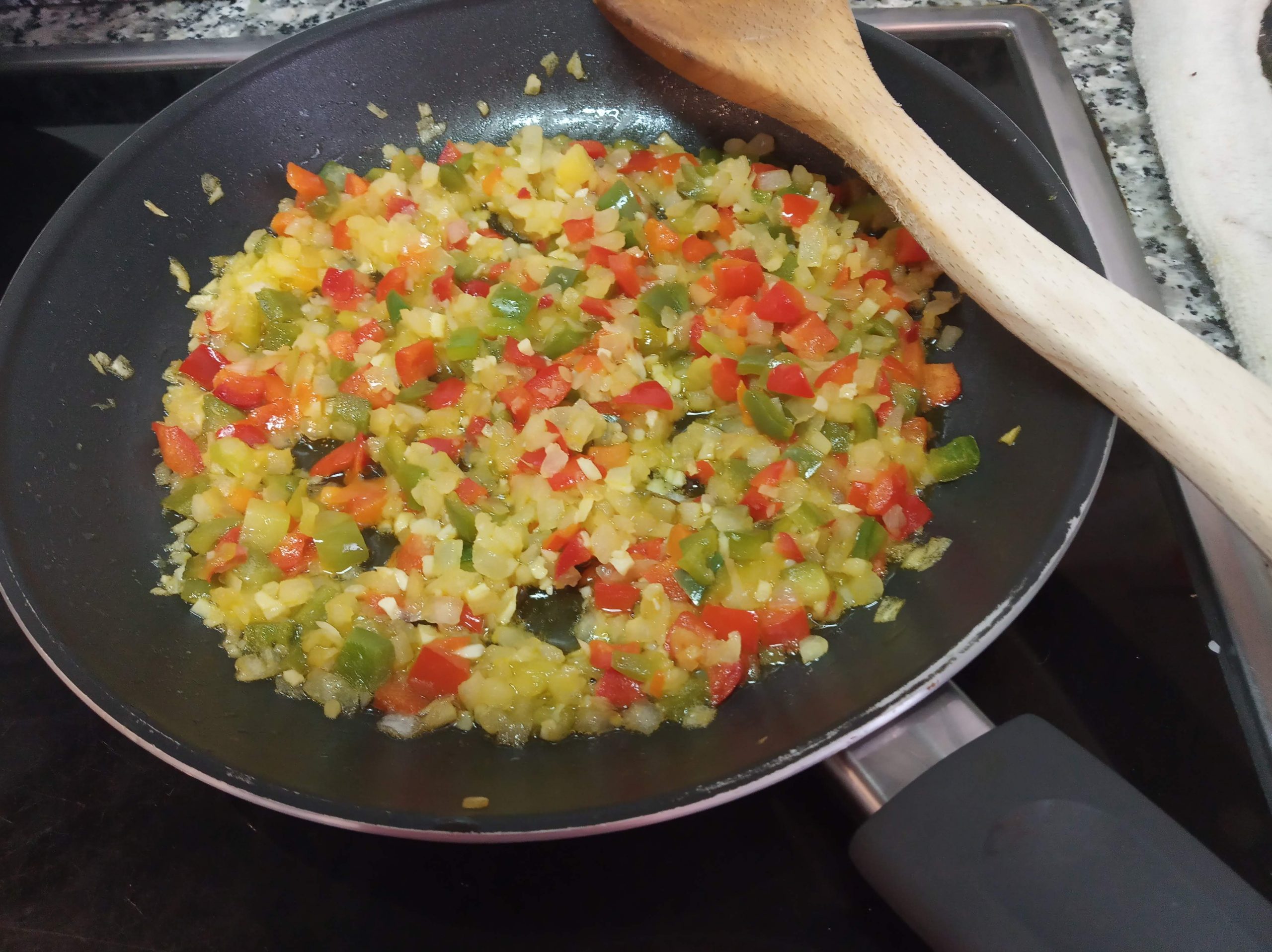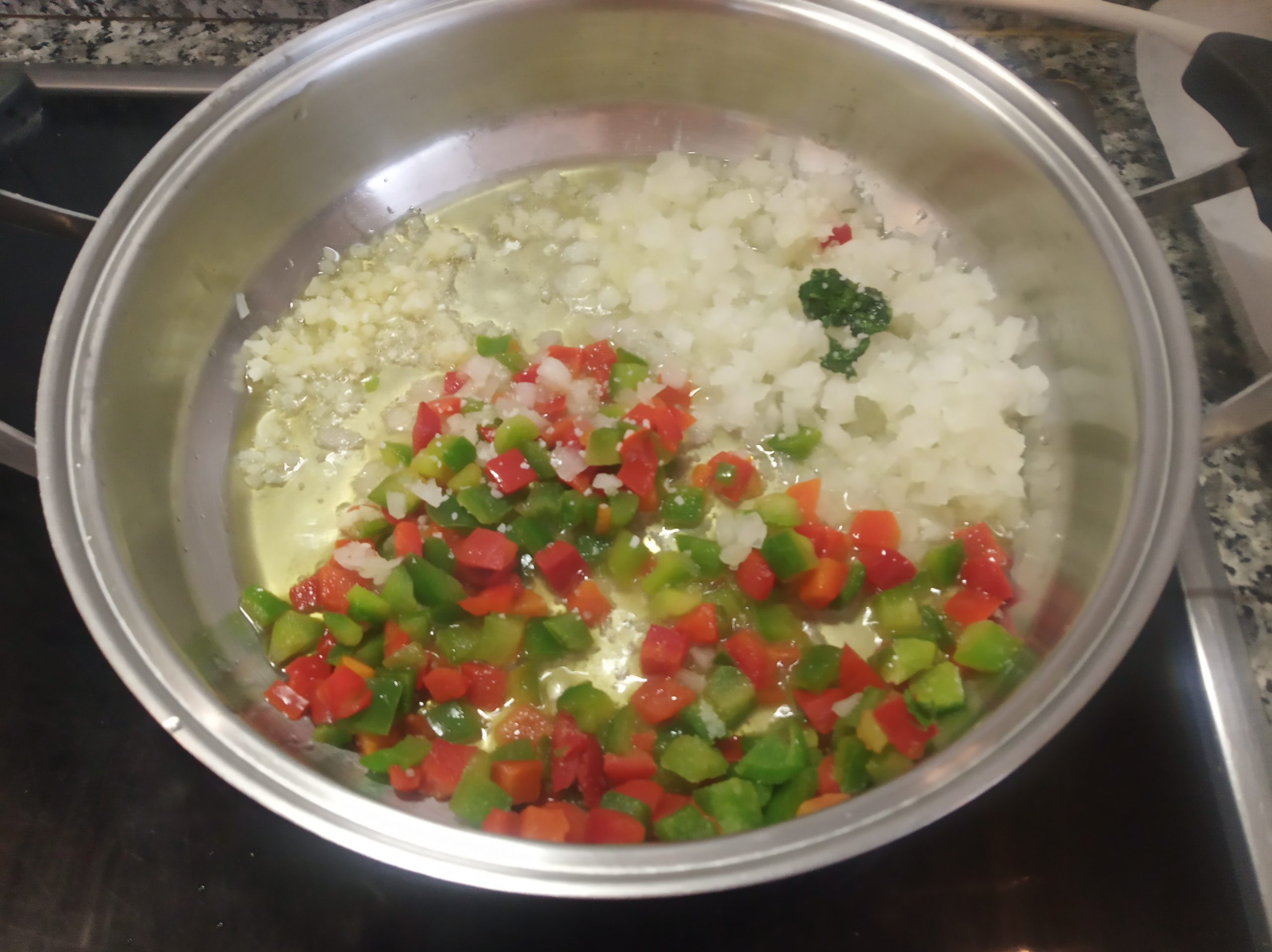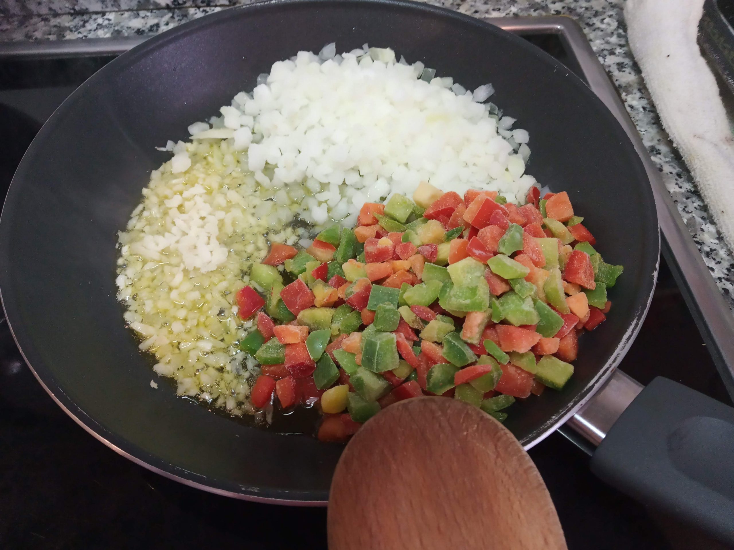 En la misma cacerola, refreír con un poco de aceite, los ajos y añadir la cebolla y los pimientos troceados, durante unos 10 minutos.