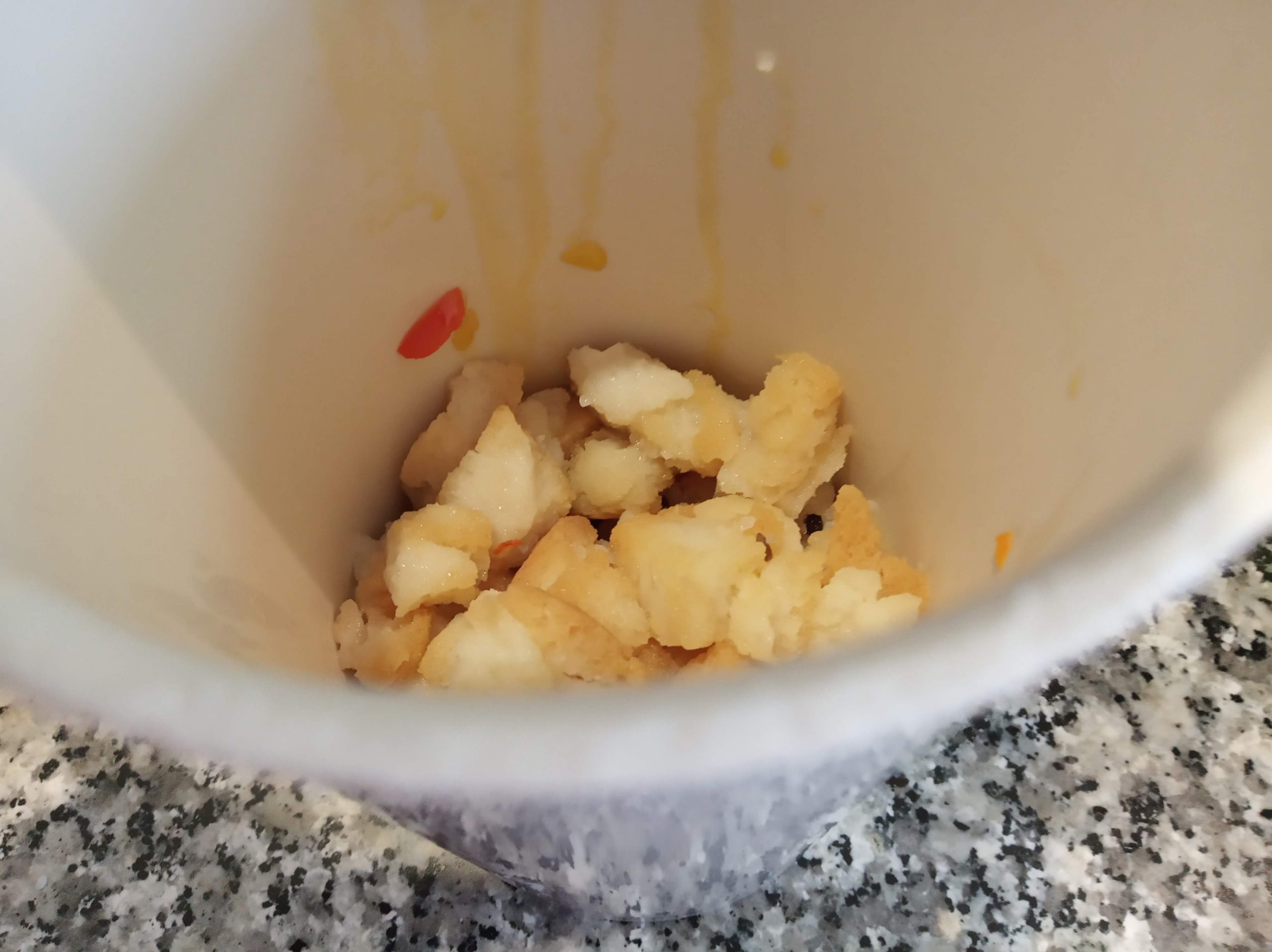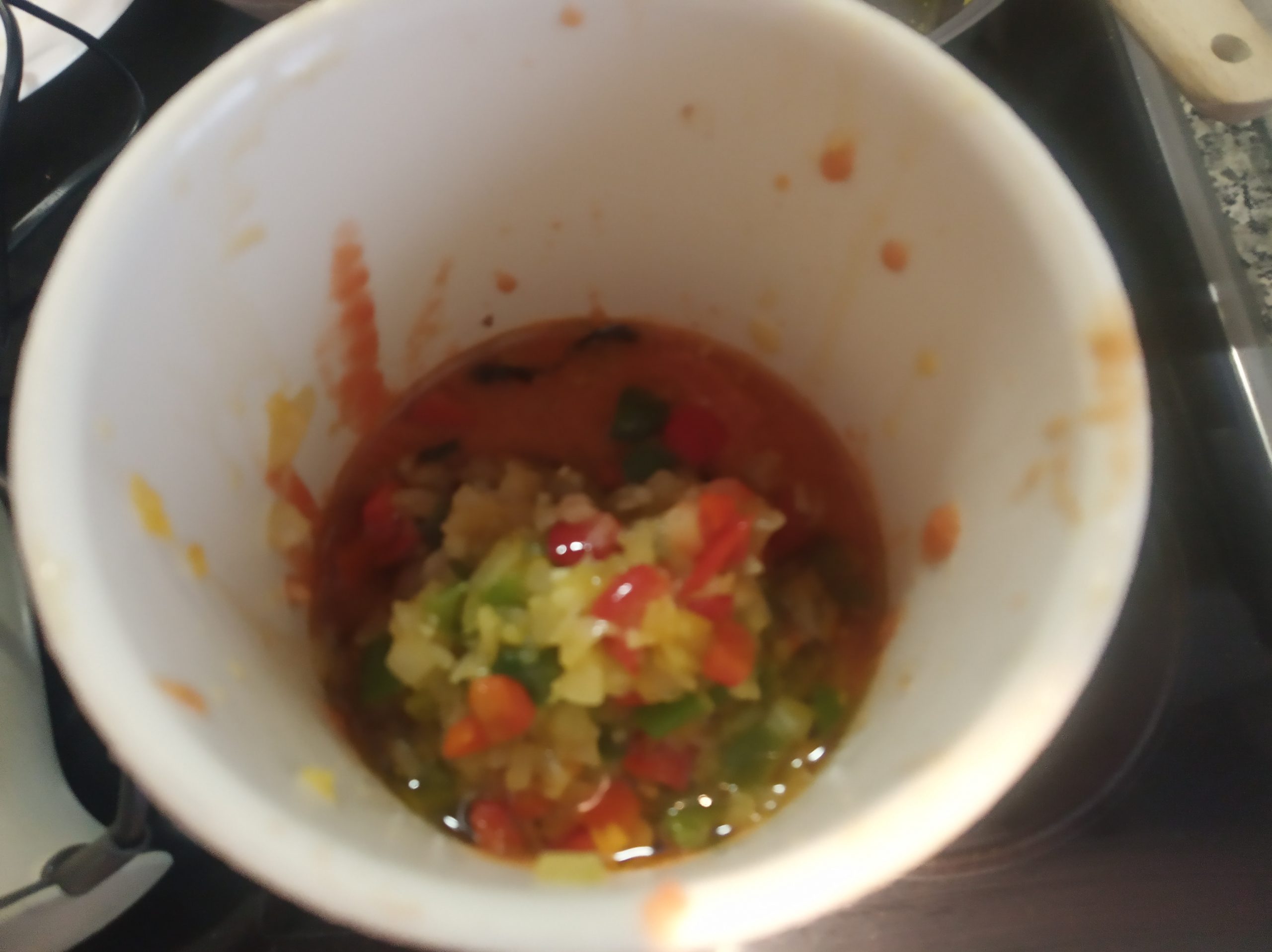 En el vaso de la batidora, echar el sofrito y los picatostes y triturar todo junto.
