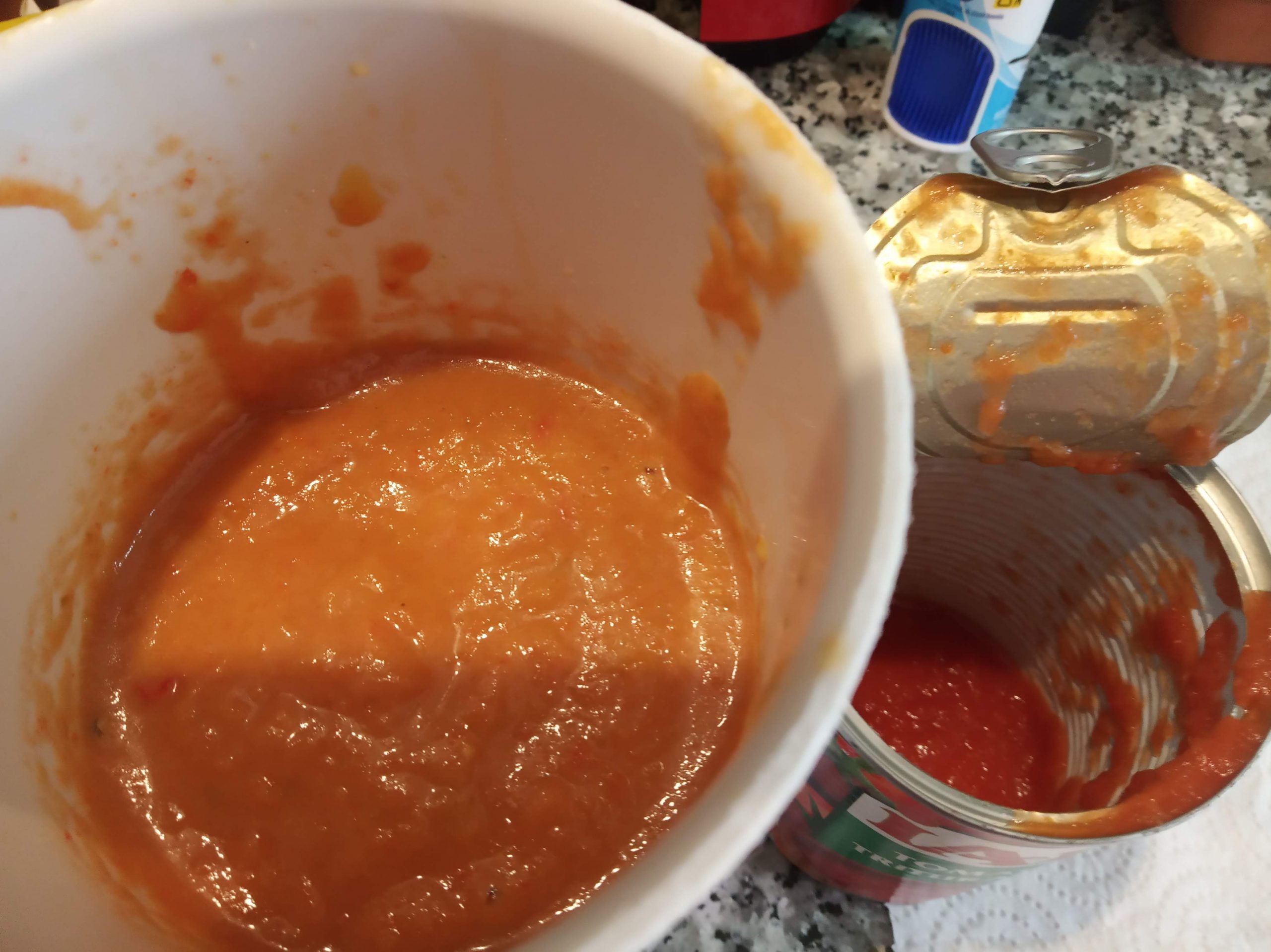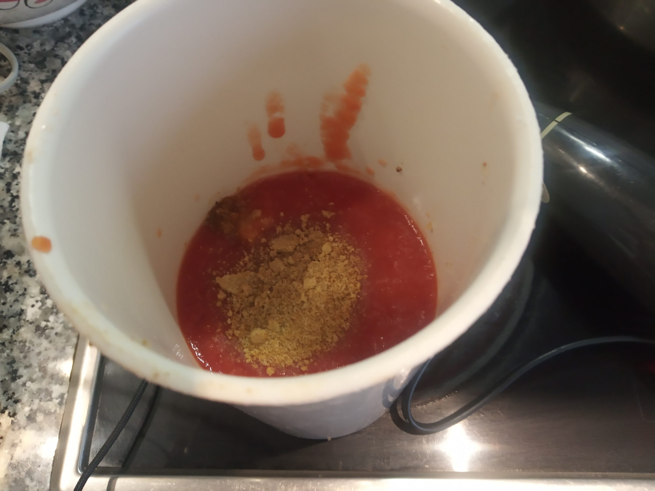 Añadir la lata de tomate, las especias, la pastilla de caldo desmenuzada, y volver a triturar todo junto.