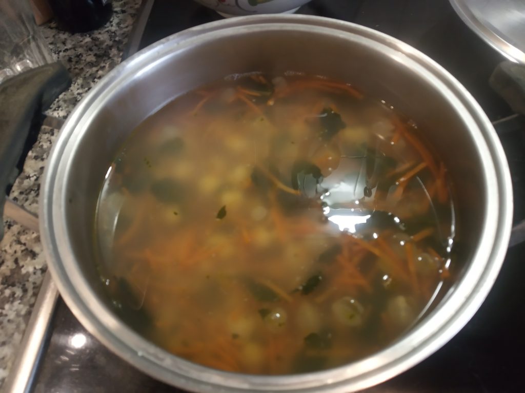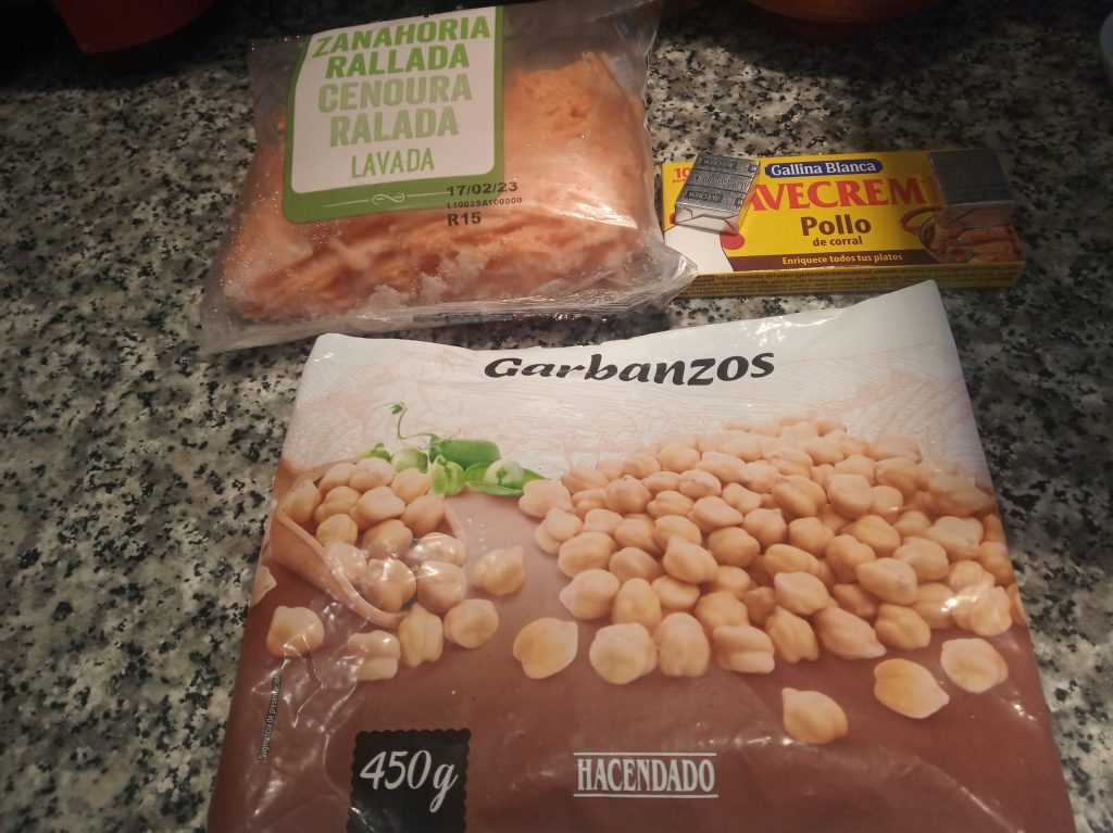 En una cacerola, echar 1 litro de agua, los garbanzos, las zanahorias y la hierbabuena, en mi caso, todo es de fondo de congelador, y las 2 pastillas de caldo de pollo desmenuzadas. Puedes utilizar solo 1 litro de caldo de pollo casero o de Brick.
