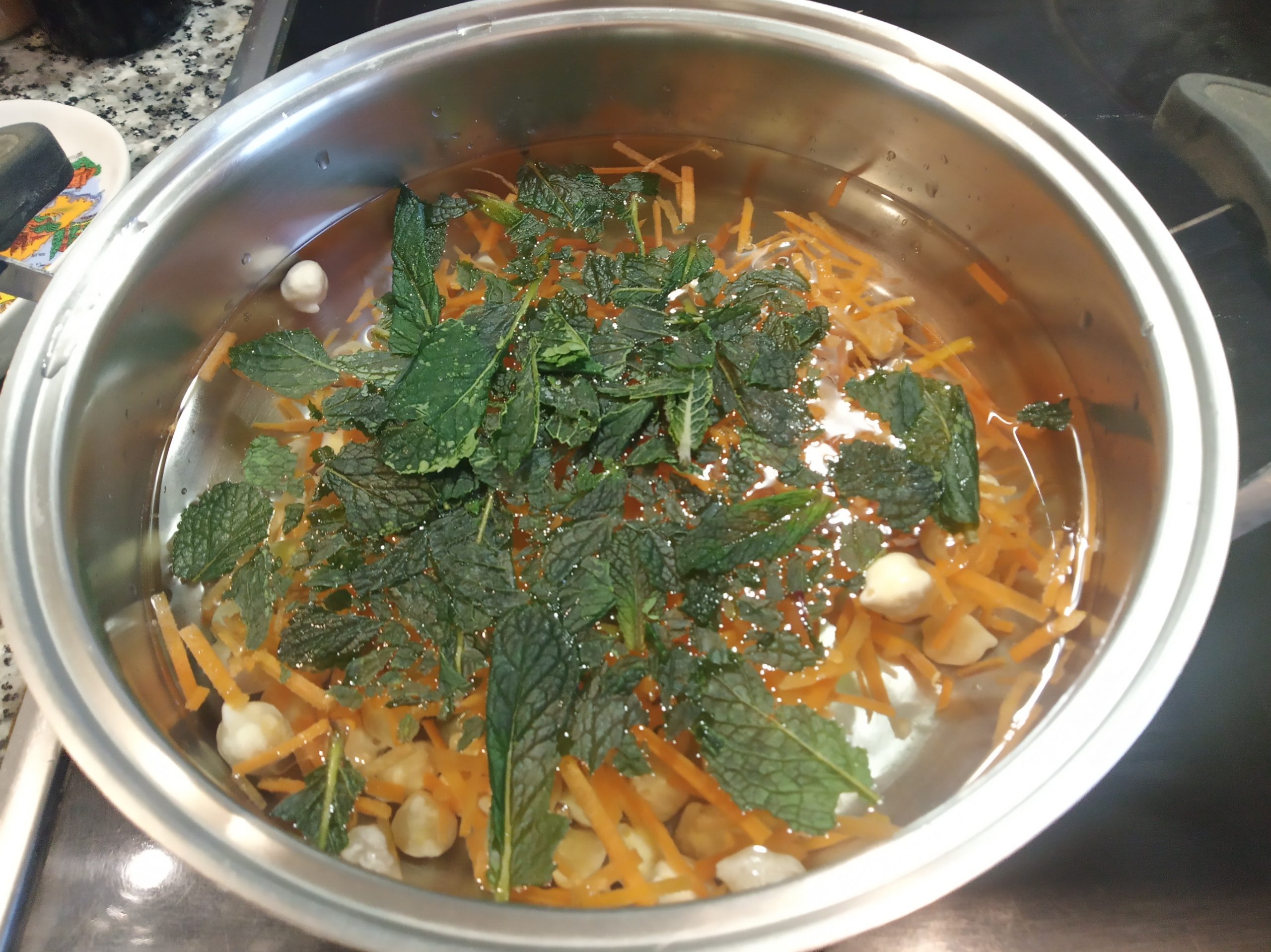 En una cacerola, echar 1 litro de agua, los garbanzos, las zanahorias y la hierbabuena, en mi caso, todo es de fondo de congelador, y las 2 pastillas de caldo de pollo desmenuzadas. Puedes utilizar solo 1 litro de caldo de pollo casero o de Brick.