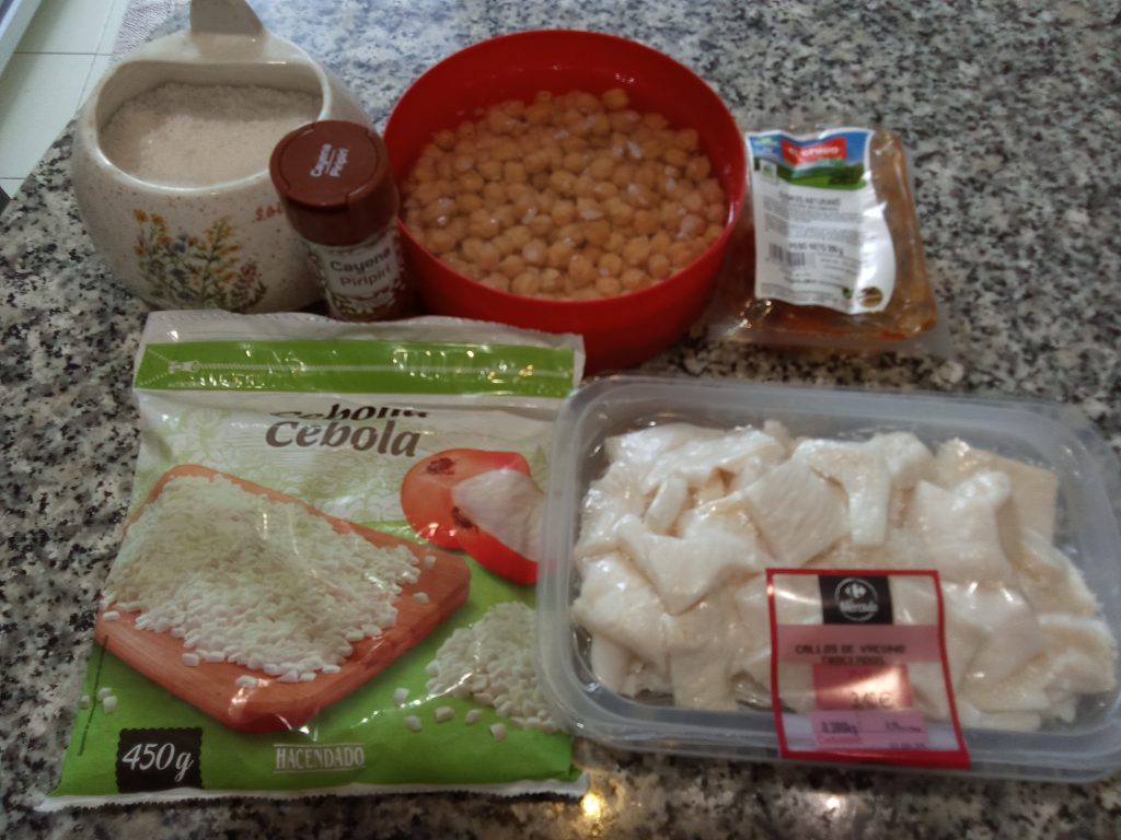 El día anterior, poner los garbanzos en remojo, con agua, sal y bicarbonato.