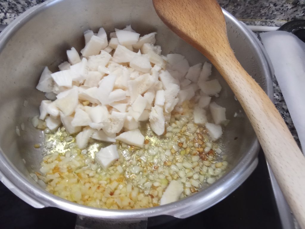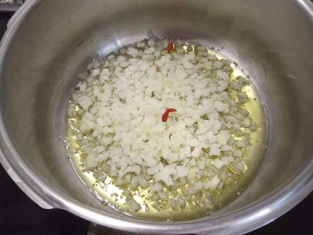 Ponemos en la olla Exprés baja, un poco de aceite y la cebolla troceada, con dos cayenas, dejar refreír unos 5 minutos, vigilar no se queme.