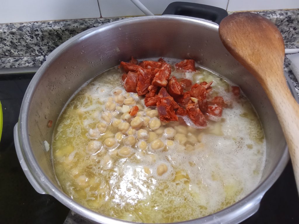 Cuando el agua este caliente, podemos echar los garbanzos, nunca con agua fría, y el chorizo, sin pellejo y cortado en trozos.