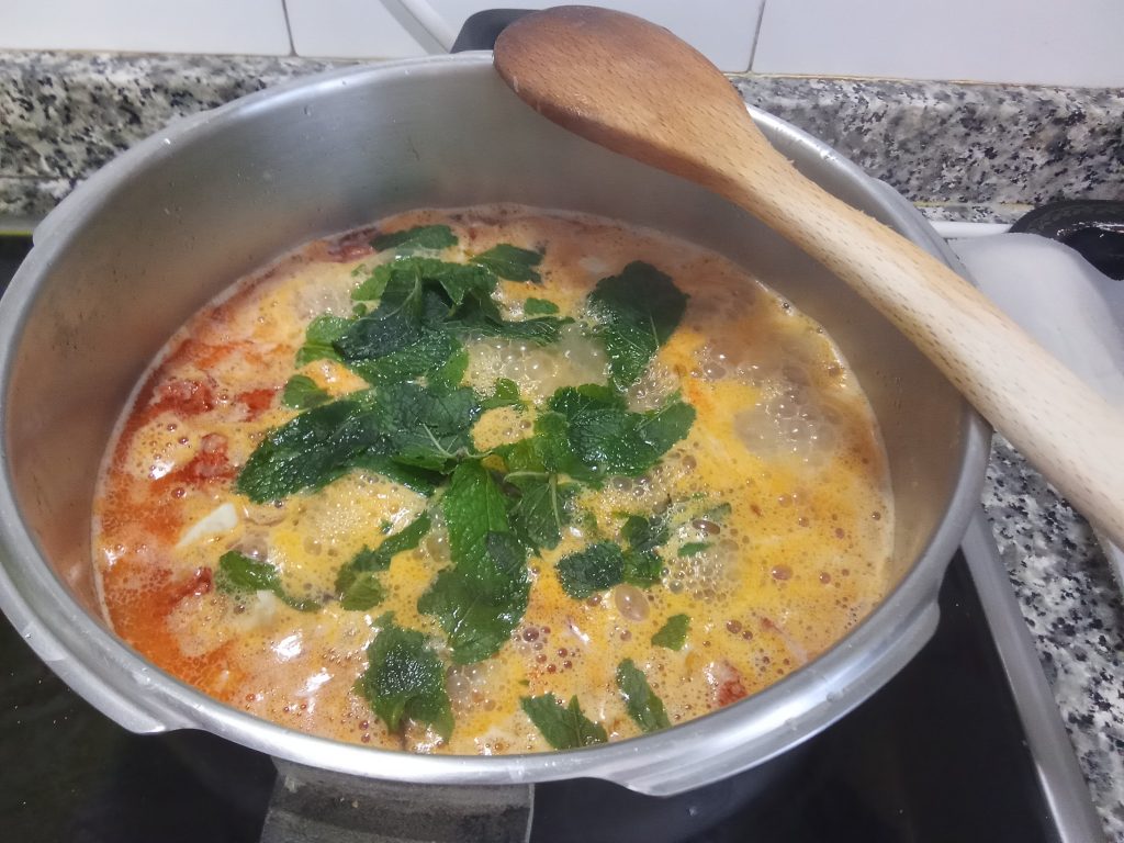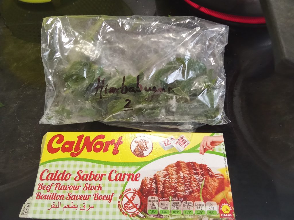 Le añadimos también la pastilla de caldo de pollo o carne, desmenuzada y buen manojo de hojas de hierbabuena, fresca o congeladas, que suelo tener yo limpias y de fondo de congelador.