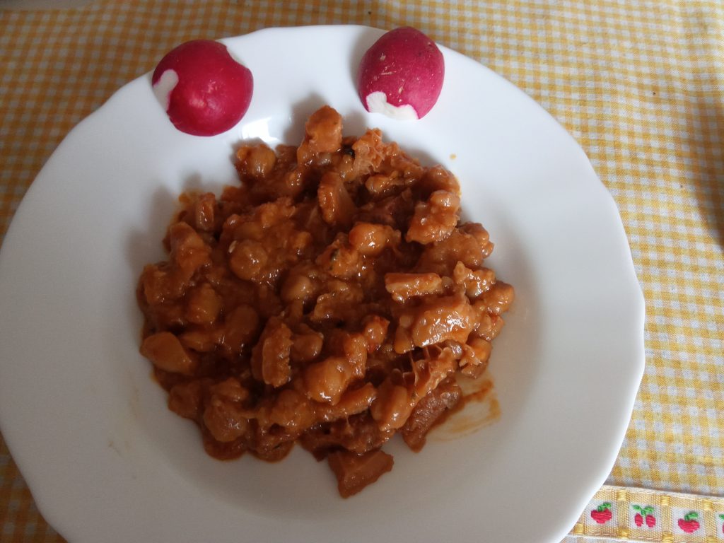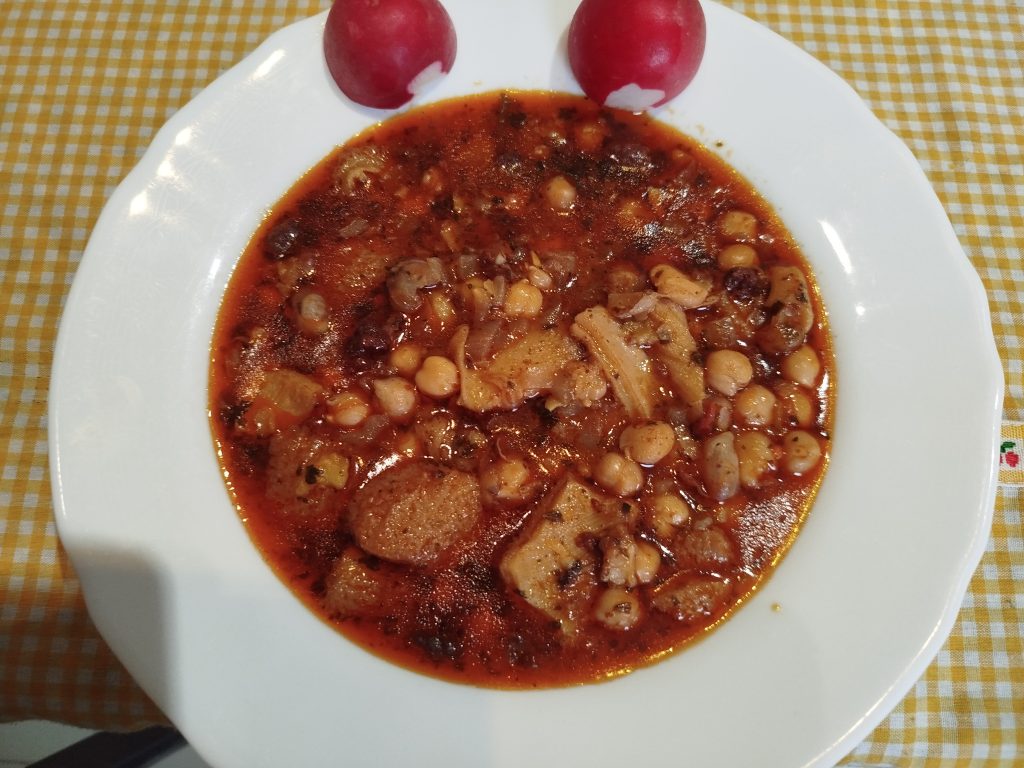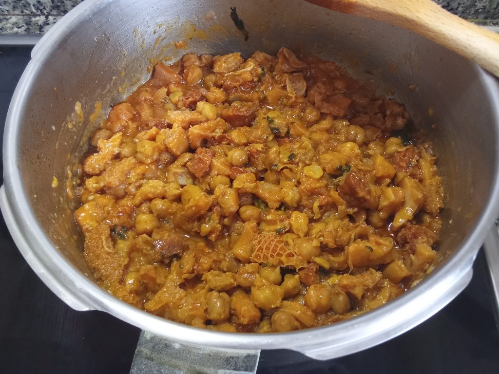 Según la receta original, la podéis hacer en una olla, cociéndolo una hora, o hasta que este todo tierno, la hierbabuena, se la echáis al final, y si utilizáis, garbanzos cocidos, lavar muy bien, y echar diez minutos antes de terminar la cocción.