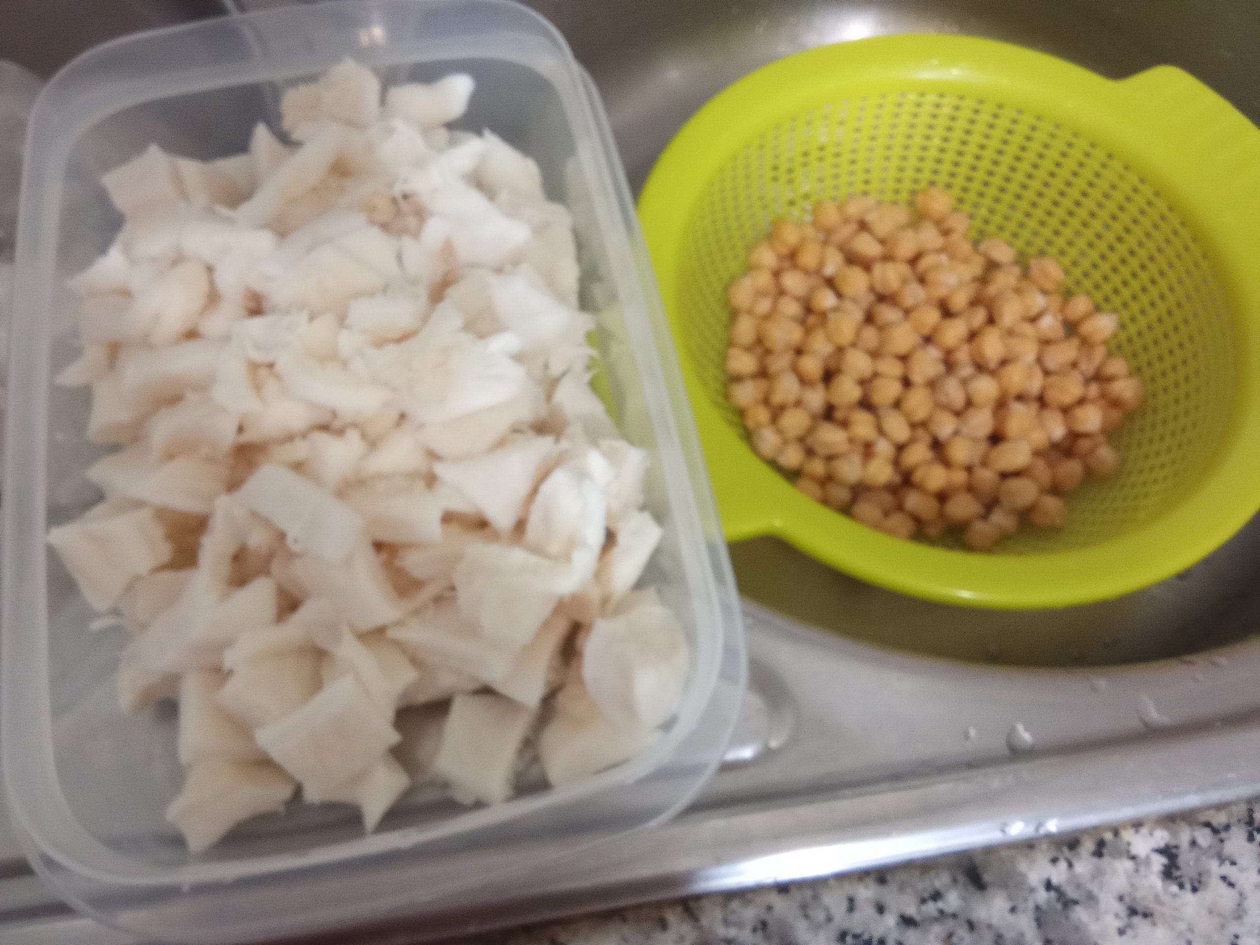 El día anterior, poner los garbanzos en remojo, con agua, sal y bicarbonato.