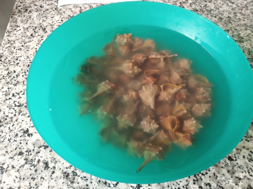 En un bol grande, echamos las Cañaíllas, con bastante sal gorda, y cubrir con agua, dejar en remojo durante 2 horas, remover de vez en cuando.