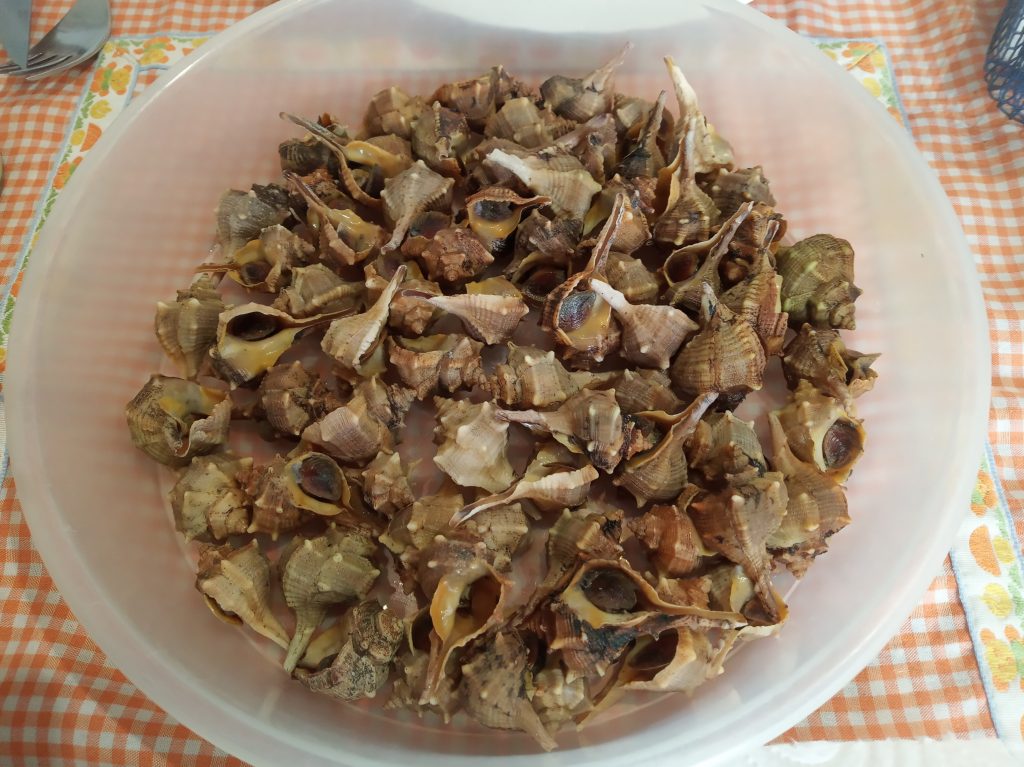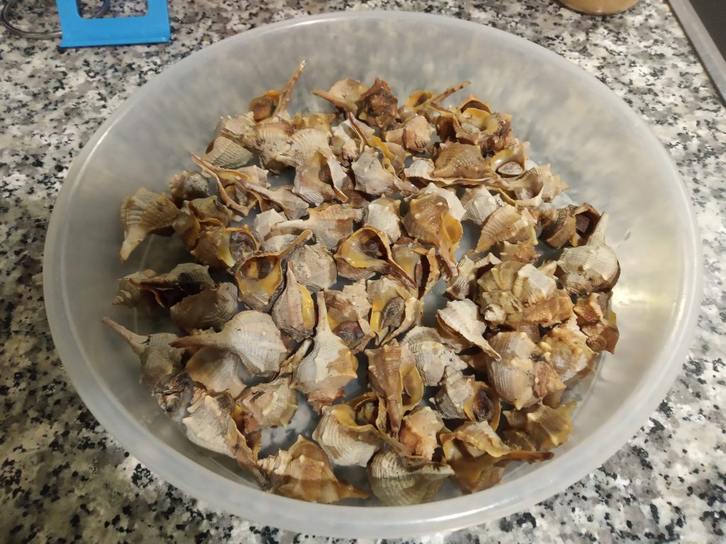 Hay un utensilio, para quitar la concha y sacar la Cañaíllas, si no lo tienes, puedes utilizar, otra Cañaílla, que tenga una punta larga, y te ayudas así, o si tienes un pincho de metal o madera, también te vale.