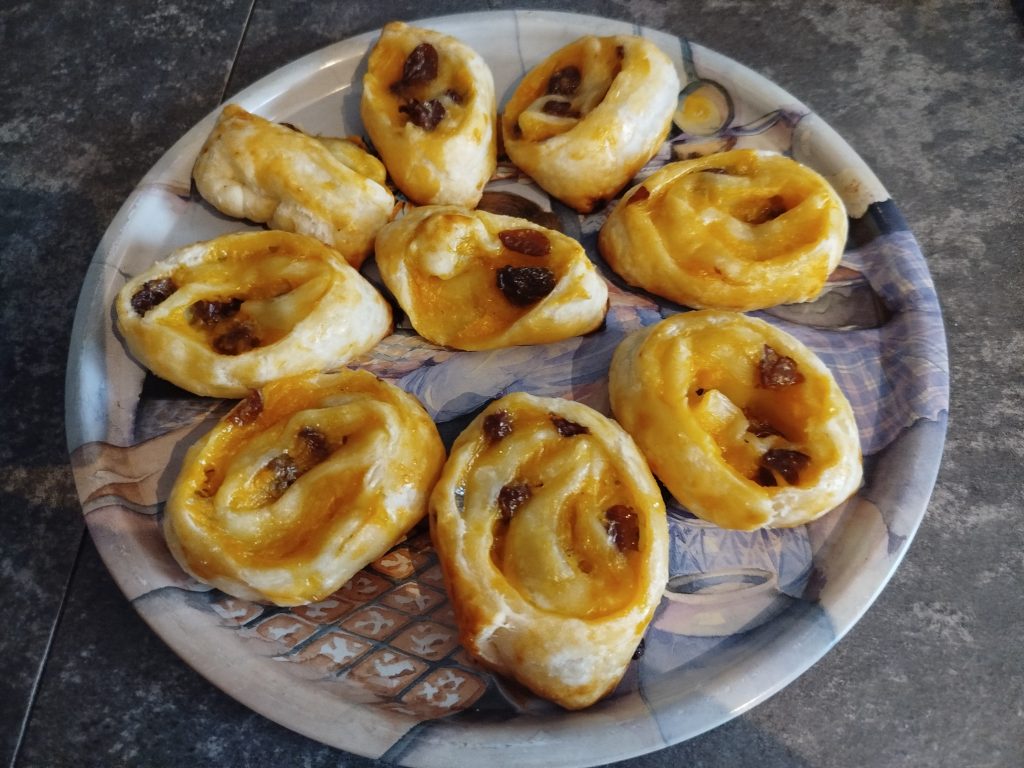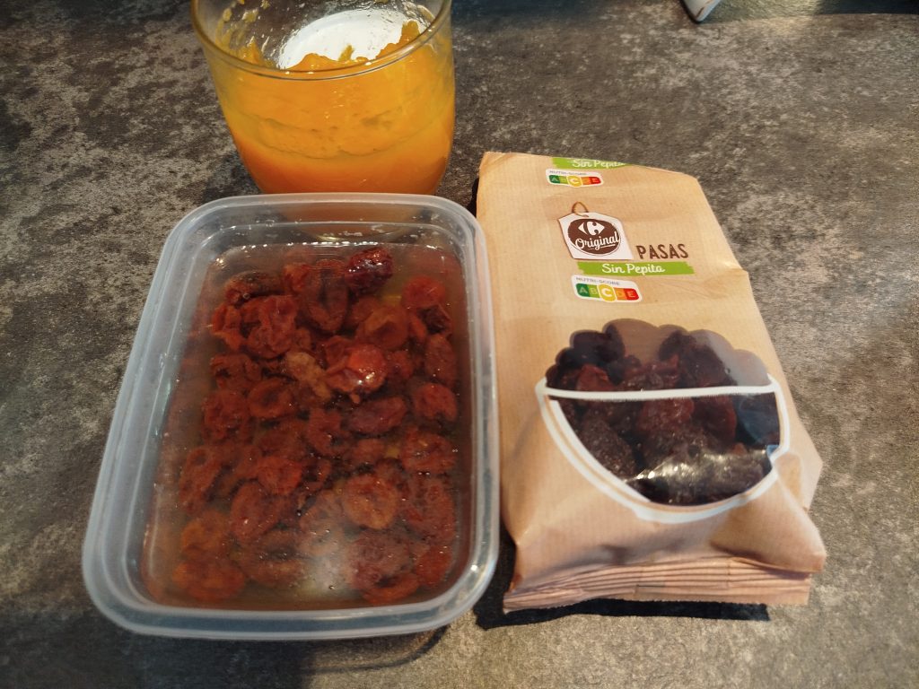 Repartir montoncito de mermelada, y extender muy bien, repartir las pasas escurridas.
