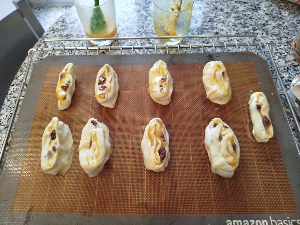 Pasar los trozos de pie, aplanar un poco, dejar espacio, entre cada uno, pintar con huevo batido.