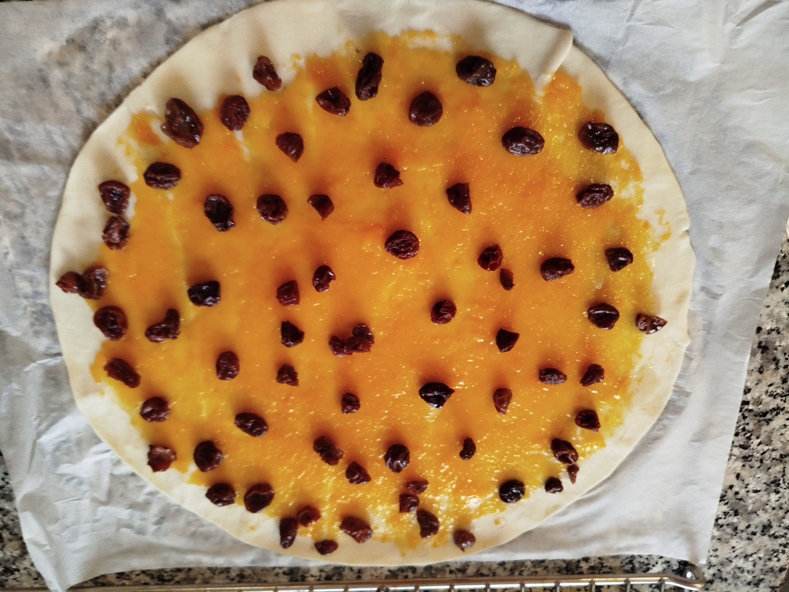 Repartir montoncito de mermelada, y extender muy bien, repartir las pasas escurridas.