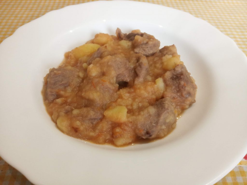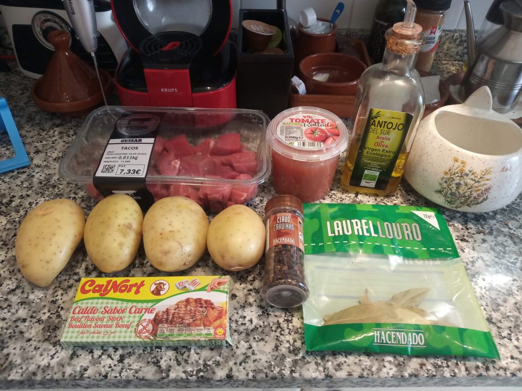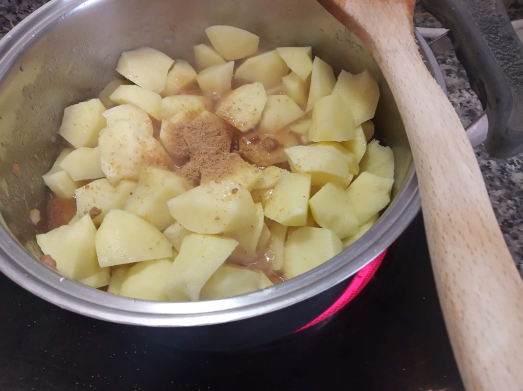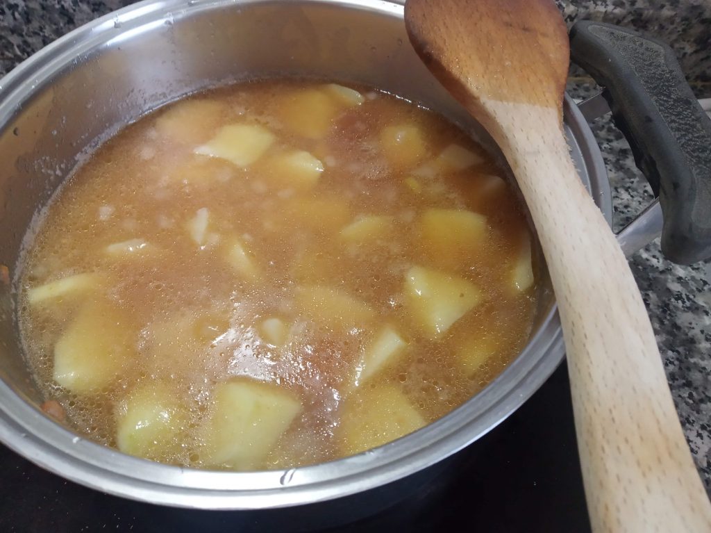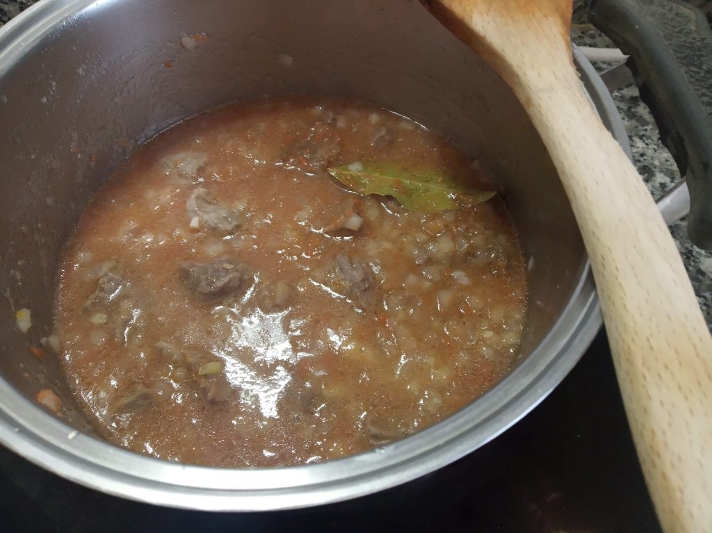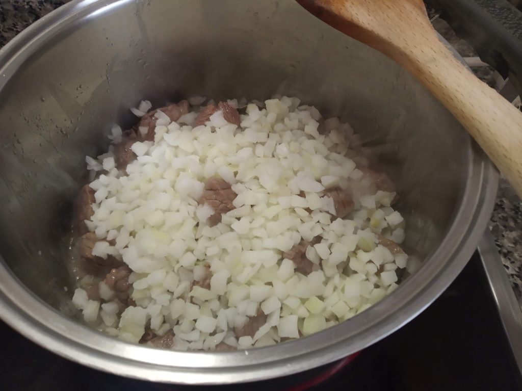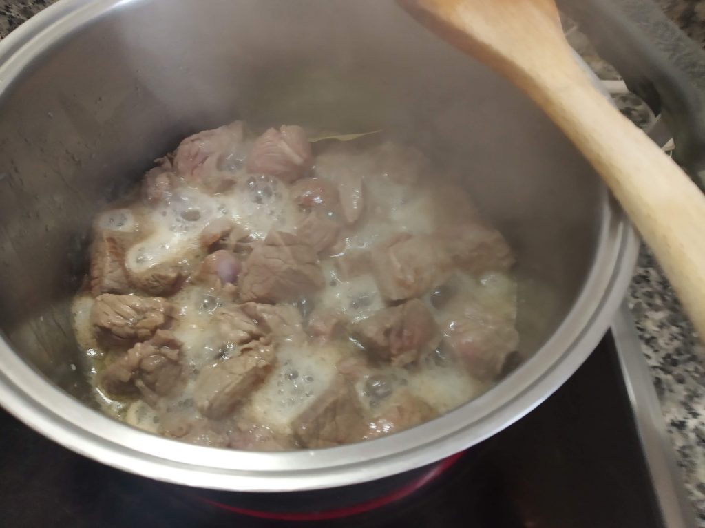 Mientras pelamos y cortamos las patatas en tacos, pasado ese tiempo, se le añade a la carne y la pastilla de caldo, mezclar y si hace falta echar más agua.