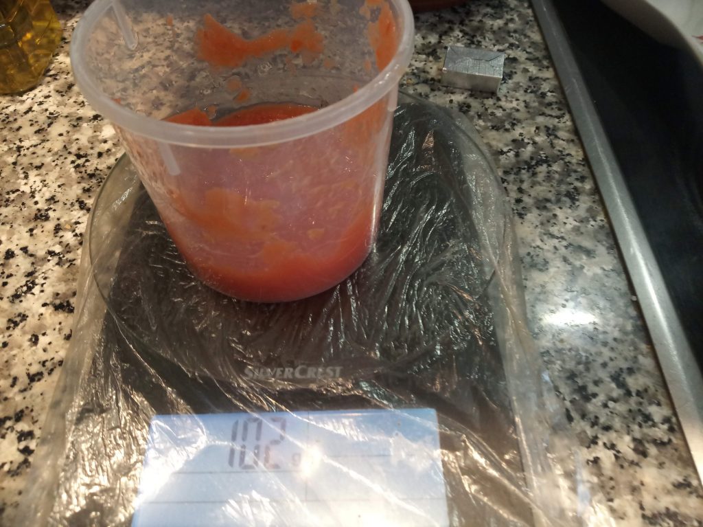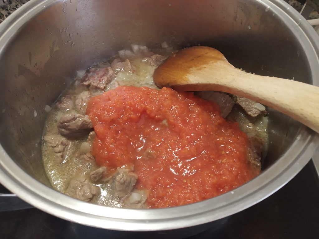 Añadir el tomate triturado, mezclar y dejar hacer unos minutos. Yo suelo comprar tomate rallado unos 300 g. natural, es muy socorrido y cuando va a caducar y me sobra, lo congelo para otra receta.